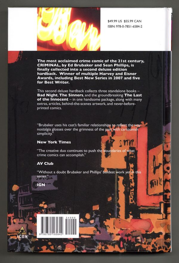 The first edition has gone through four printings, in sellout after sellout, and now the rest of Brubaker and Phillips' noir masterpiece is collected in the same format. Collecting BAD NIGHT, THE SINNERS and THE LAST OF THE INNOCENT - along with short stories, behind-the-scenes pieces, art and articles, all previously uncollected.
