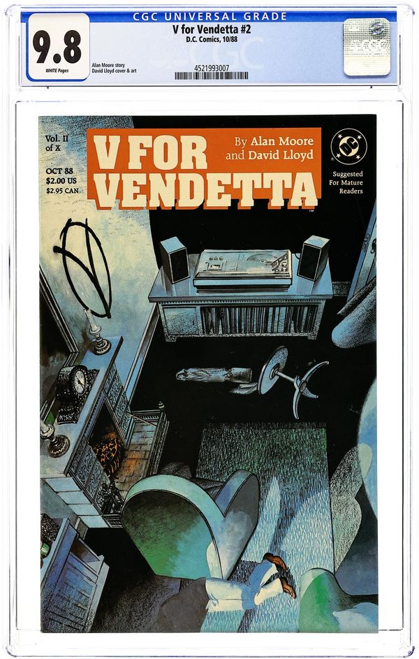 Part 2 of 10. "Versions" - 6 pages. "The Vision" - 6 pages. "Virtue Victorious" - 6 pages. "The Valley" - 8 pages. Story by Alan Moore. Art and cover by David Lloyd. Each chapter is reprinted from an issue of Warrior (1982 magazine UK) in color for the first time with extra images connecting the chapters. Stories in this issue are from Warrior issues 5-8. V continues his assault on the upper factions of Britains rulers as he enlists Eveys help in his plans for the highest Bishop in the land. Full color. 32 pages. Cover price $2.00. Grade: CGC 9.8 explanation of grade Condition: Used (collectible)