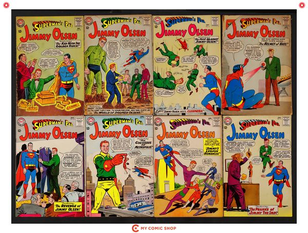 Issues 68, 71-74, 76-78 of Superman's Pal Jimmy Olsen (1954). Most will grade in the FR to GD range with #74 grading VG and #78 FN.