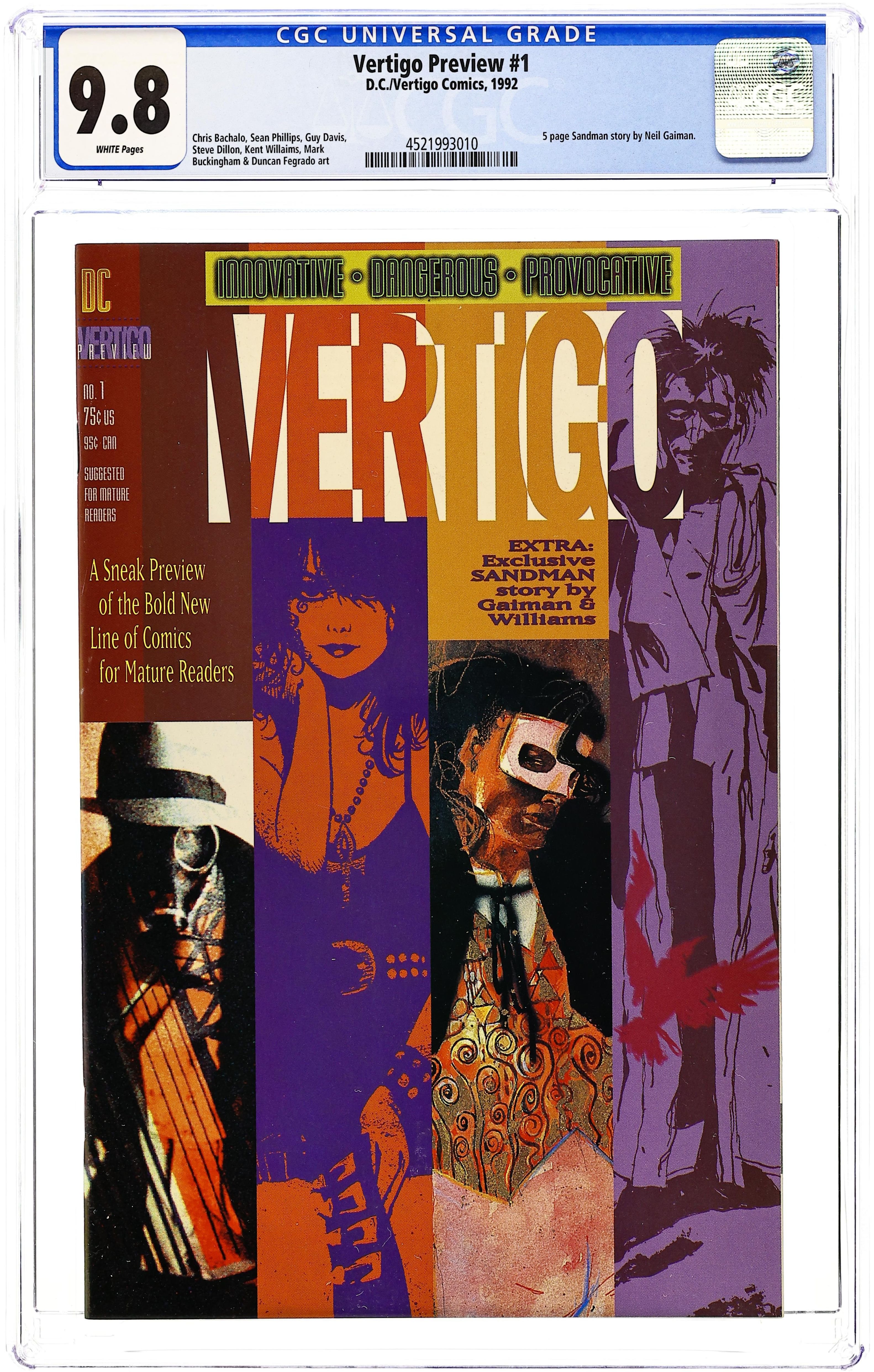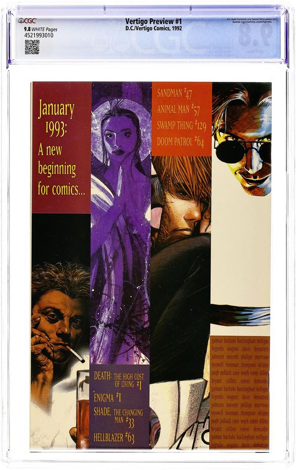 Vertigo preview featuring an exclusive Sandman story by Neil Gaiman and Kent Williams. Contains two page previews of Death: The High Cost of Living, Enigma, Sandman Mystery Theater, Mercy, Kid Eternity, Sebastian O, Black Orchid, Sandman, Hellblazer, Doom Patrol, Animal Man, Swamp Thing, and Shade the Changing Man. Cover price $0.75. Grade: CGC 9.8 explanation of grade Condition: Used (collectible)