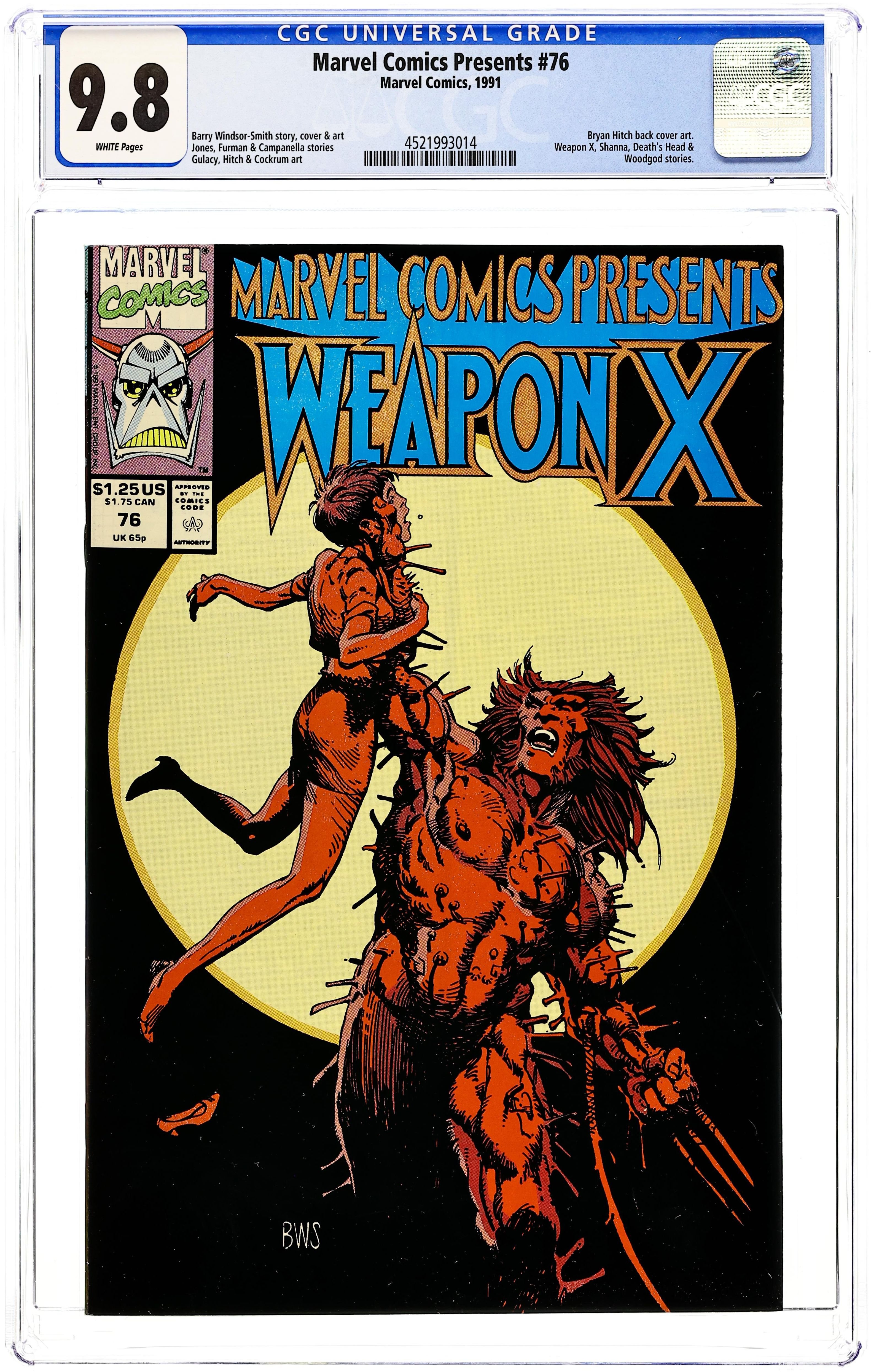 Cover art by Barry Windsor-Smith. Weapon X (chapter 4), script and art by Barry Windsor-Smith. The Living and the Dead (The Bush of Ghosts part 9) starring Shanna the She-Devil, script by Gerard Jones, pencils by Paul Gulacy, inks by Gary Martin. The Deadliest Game starring Death's Head, script by Simon Furman, pencils by Bryan Hitch, inks by Mark Farmer. Lonely At the Top starring Woodgod, script by Robert Campanella, art by Dave Cockrum. Back cover art by Bryan Hitch. 36 pgs. Cover price $1.25. Grade: CGC 9.8 explanation of grade Condition: Used (collectible)