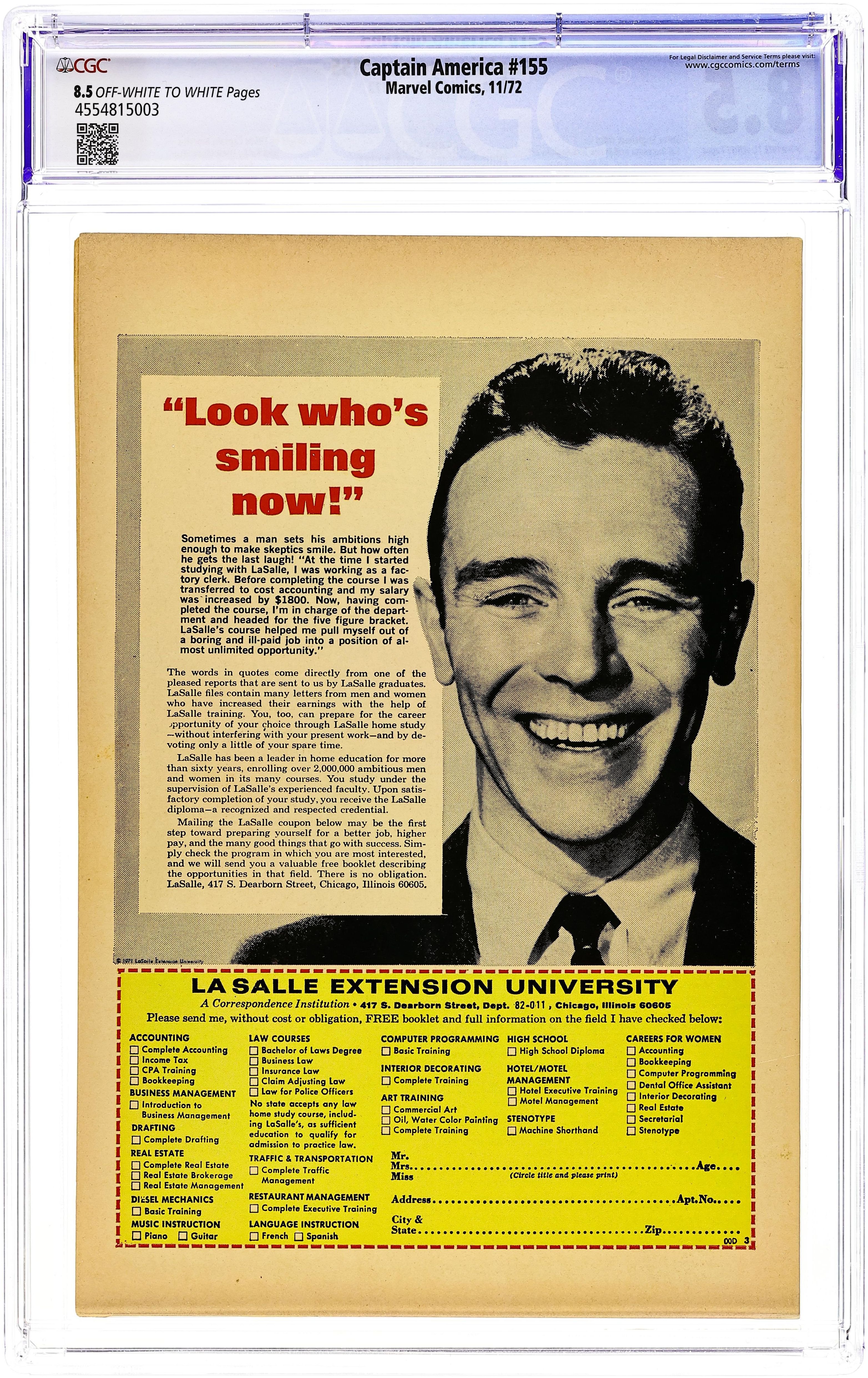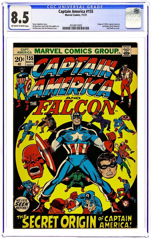 "The Incredible Origin of the Other Captain America!" Part 3 of 4. Script by Steve Englehart. Pencils by Sal Buscema. Inks by Frank McLaughlin. Cover by Sal Buscema and Jim Mooney. Steve Rogers and Sharon Carter are enjoying their vacation in the Bahamas...when they are suddenly ambushed on the beach by Captain America (aka William Burnside) and Bucky (aka Jack Monroe)! Steve and Sharon don't know what is happening, but they realize they're in grave danger! Luckily, the Falcon and Redwing arrive on the sand and join the battle! But Cap and Bucky have super-strength, and they win. Then the 1950s Captain America spins the astonishing tale of how he came to be. Origins of William Burnside and Jack Monroe. (Note: This issue includes 3 pages of excerpts from Young Men #24 (published in 1953) with script by Don Rico and art by John Romita Sr.) 36 pages. Cover price $0.20. Grade: CGC 8.5 explanation of grade Condition: Used (collectible)