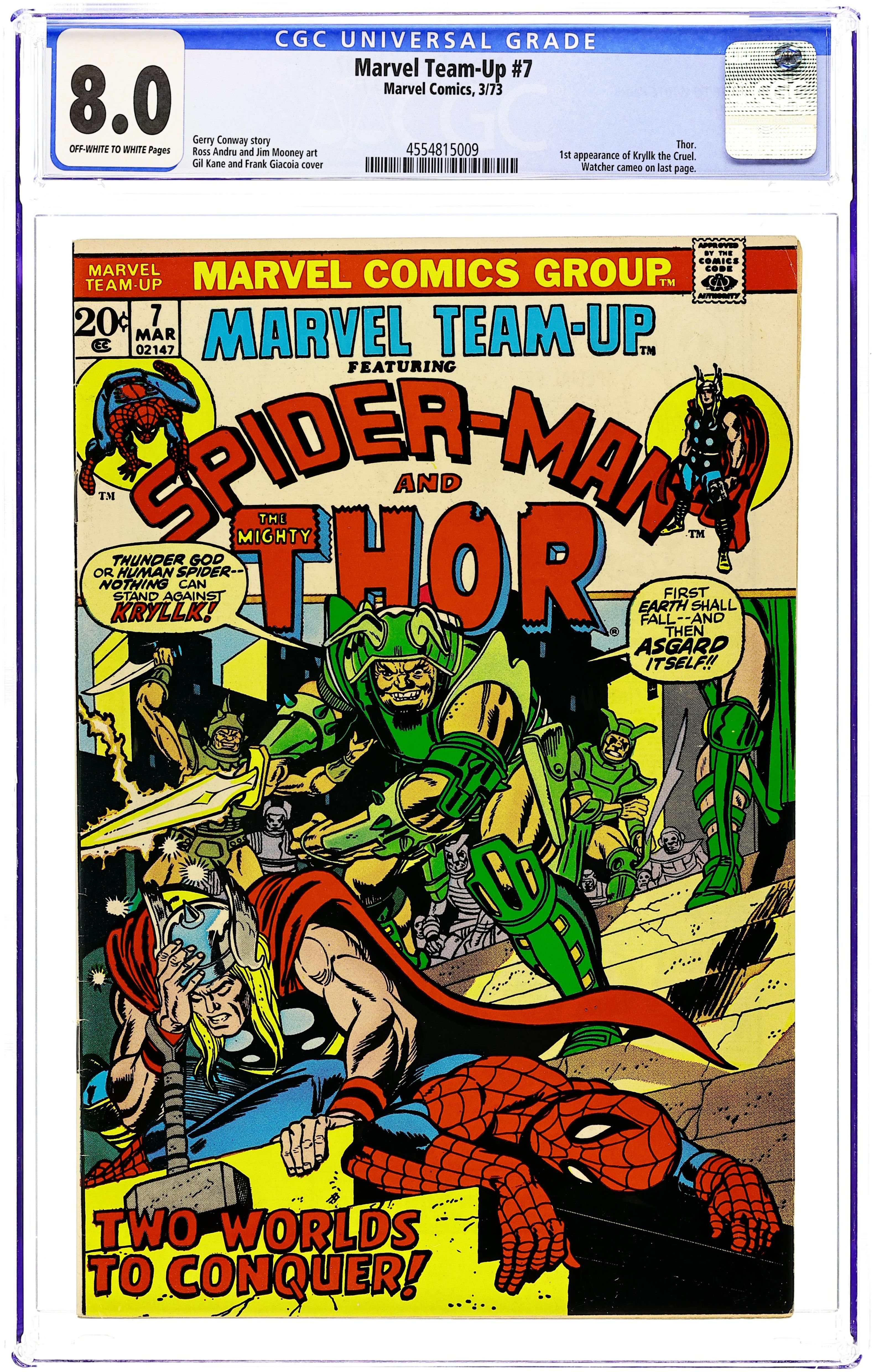 "A Hitch in Time!" Guest-starring Spider-Man and Thor. Script by Gerry Conway. Pencils by Ross Andru. Inks by Jim Mooney. Cover by Gil Kane and Frank Giacoia. Peter Parker stops an attempted mugging in a back alley...and afterwards bumps into the Prince of Asgard! Talk about a chance encounter! As Thor converses with Aunt May's nephew, a bright light begins shining in the sky...and suddenly the whole world turns inside out! Seconds later Kryllk and his armed minions attack! In order to defeat the Asgardian troll, Thor will travel to an asteroid near Jupiter, while Spider-Man journeys to majestic Asgard! Cameo appearances by the Scarlet Witch, Iron Man, Fandral, and the Watcher. 36 pages. Cover price $0.20. Grade: CGC 8.0 explanation of grade Condition: Used (collectible)