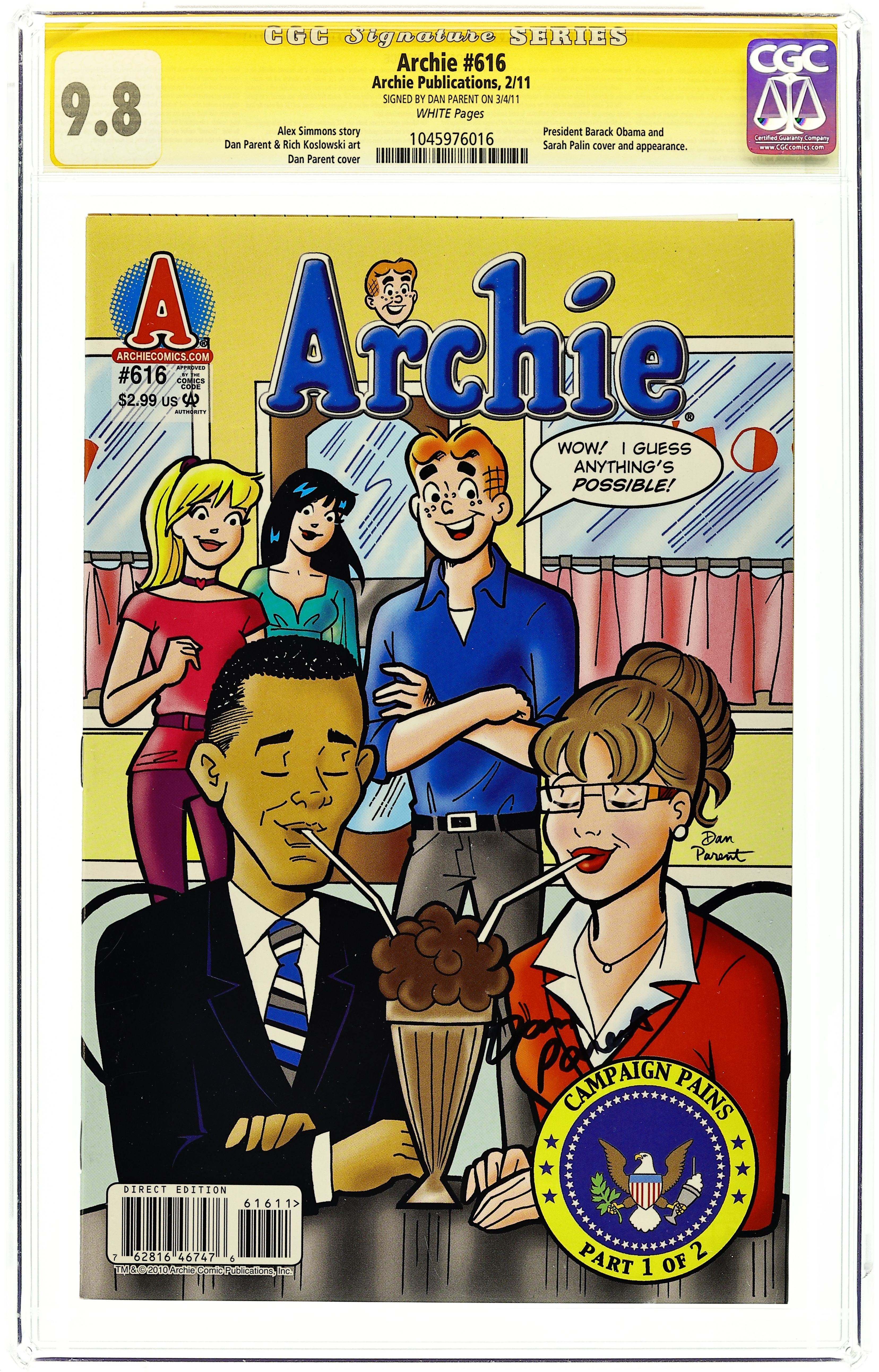 Campaign Pains: Part 1- Written by Alex Simmons. Art and Cover by Dan Parent. President Barack Obama and former Alaska governor Sarah Palin get involved as Student Government campaigns spiral out of control at Riverdale High! The race between Archie and Reggie gets hot as campaign chaos reaches to the top, forcing an impromptu visit from these big-name politicos, who get pulled into the fray! 32 pages, full color. Cover price $2.99. Grade: CGC 9.8 explanation of grade Condition: Used (collectible)