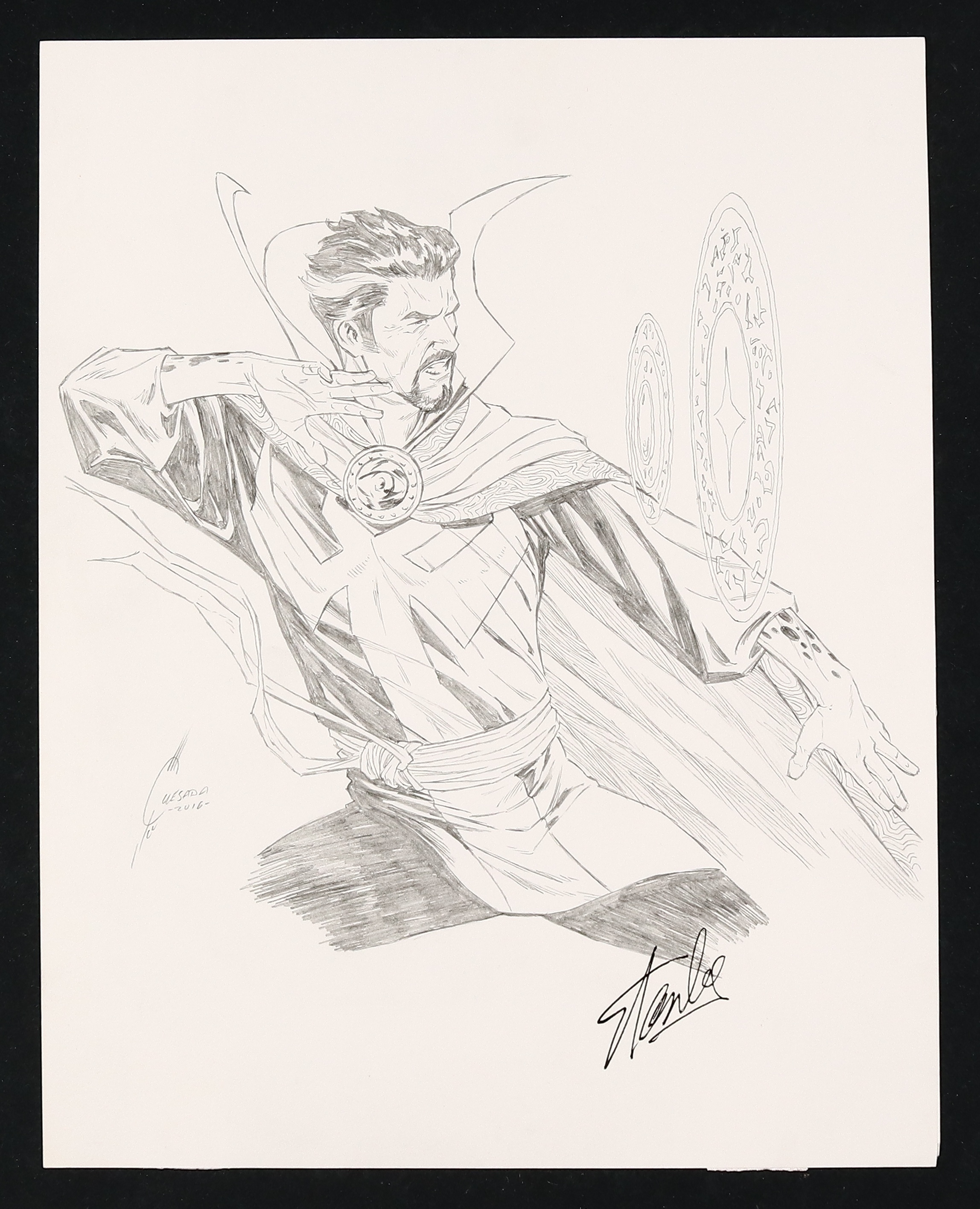 Easily one of the best artists of the modern age, Joe Quesada's incredible rich, detailed linework captures characters at their most iconic as evidenced here in this stunning commission of Doctor Strange mid spell-cast! Quesada's contributions to comics stretch far beyond his incredible skill with a pencil. His vision as an editor helped pull Marvel out of the 90's rut and brought it into the new millennium with the Marvel Knights, MAX, and Ultimate lines redefining characters for a new generation and creating a tremendous amount of excitement. Signed by Quesada as well by the Man himself, Stan Lee. Pencil on the reverse of comic art board. 8 3/4" x 11".