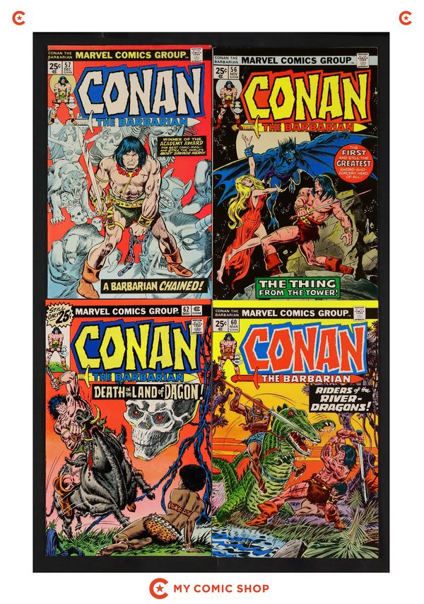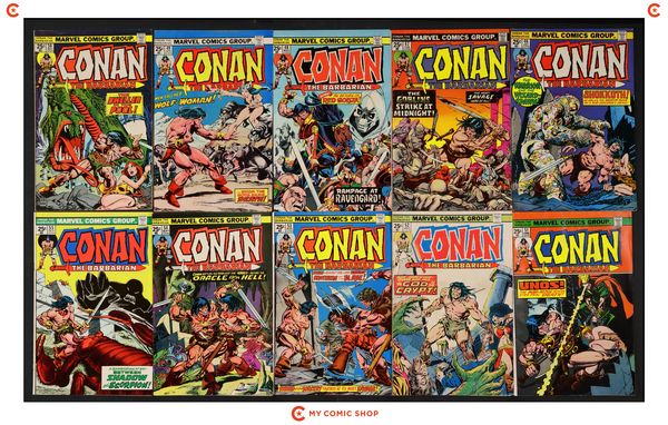 Issues 46-57, 60, and 62 of Conan the Barbarian (1970 Marvel). Most will grade in the FN to VG range with #52 grading GD.