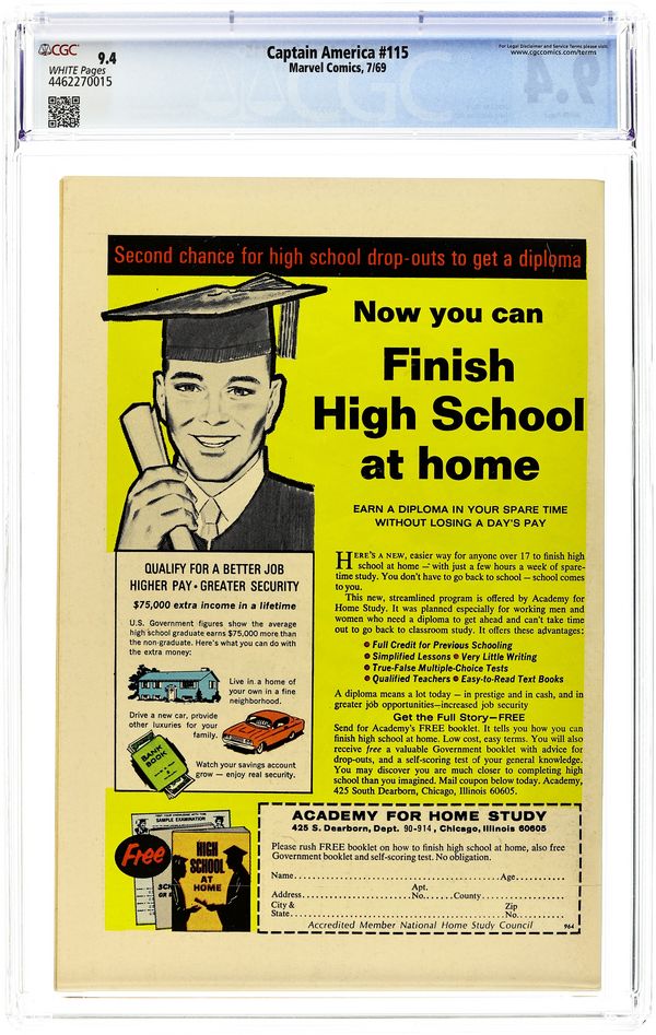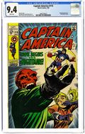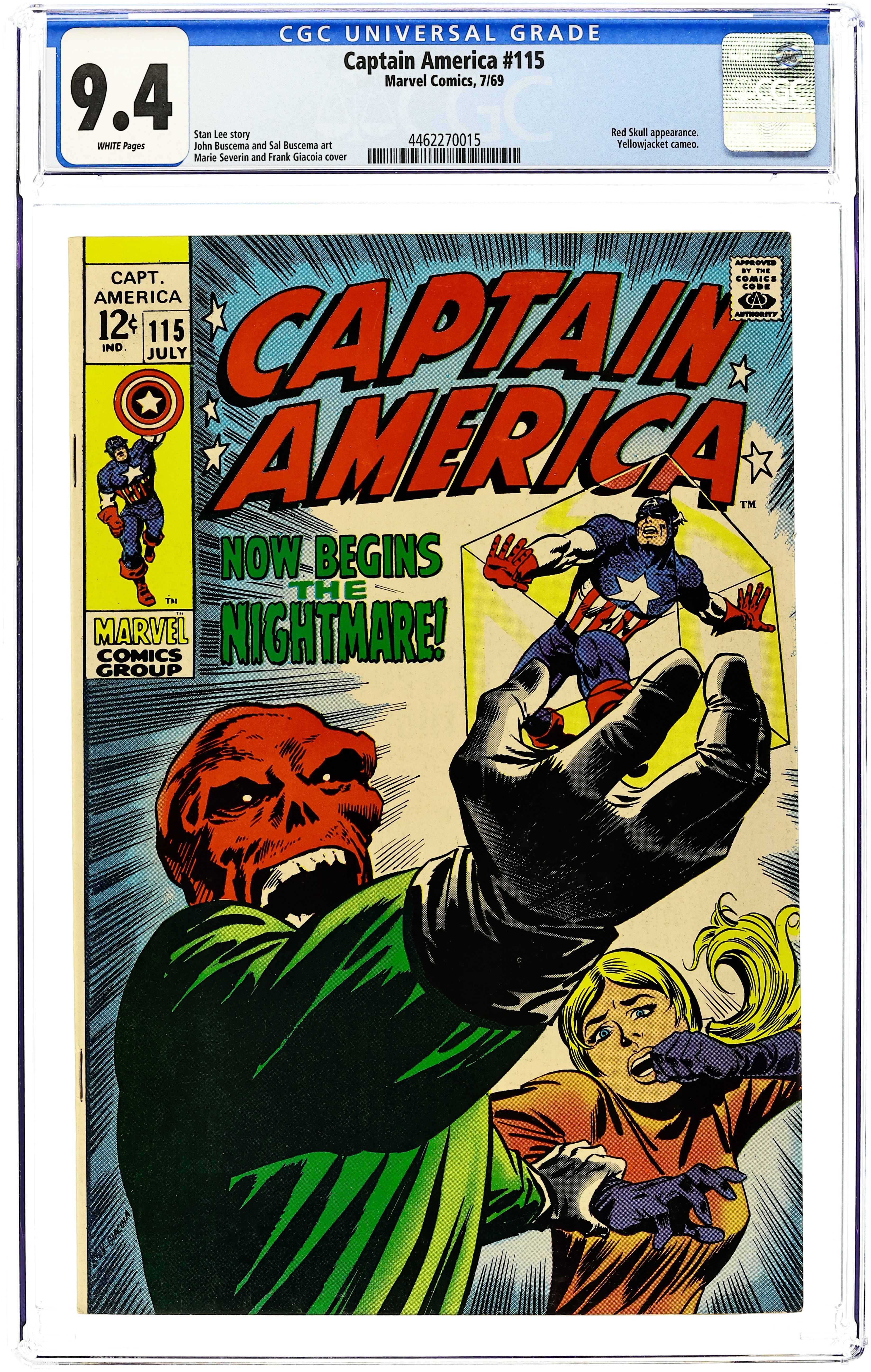 Last 12-cent cover price. Cover pencils by Marie Severin, inks by Frank Giacoia. Using the Cosmic Cube, the Red Skull switches bodies with Captain America in "Now Begins the Nightmare!", script by Stan Lee, pencils by John Buscema, inks by Sal Buscema (Panels 3 and 4 of page 12 retouched by John Romita Sr.); With the Cosmic Cube in his possession, the Red Skull confronts Captain America; Back at SHIELD headquarters, Rick Jones searches for Captain America and asks Sharon Carter if she has seen him; Although she is testing a new SHIELD weapon, Sharon tells Rick that he hasn't seen Captain America since she rejected his request that she leave SHIELD; Rick contacts his old gang of Ham radio enthusiasts, the Teen Brigade, and asks them all to out for Captain America and report back if they see him; Meanwhile, the Red Skull continues using the Cosmic Cube in ways to drive Captain America insane, hurtling him from this realm to different worlds and shrinking him down in size. 36 pgs., full color. $0.12. Cover price $0.12. Grade: CGC 9.4 explanation of grade Condition: Used (collectible)