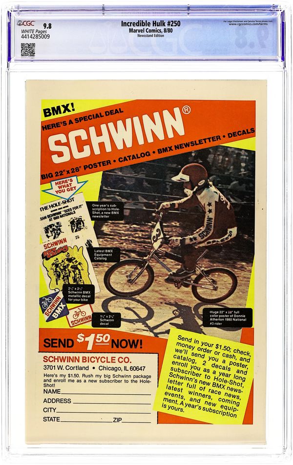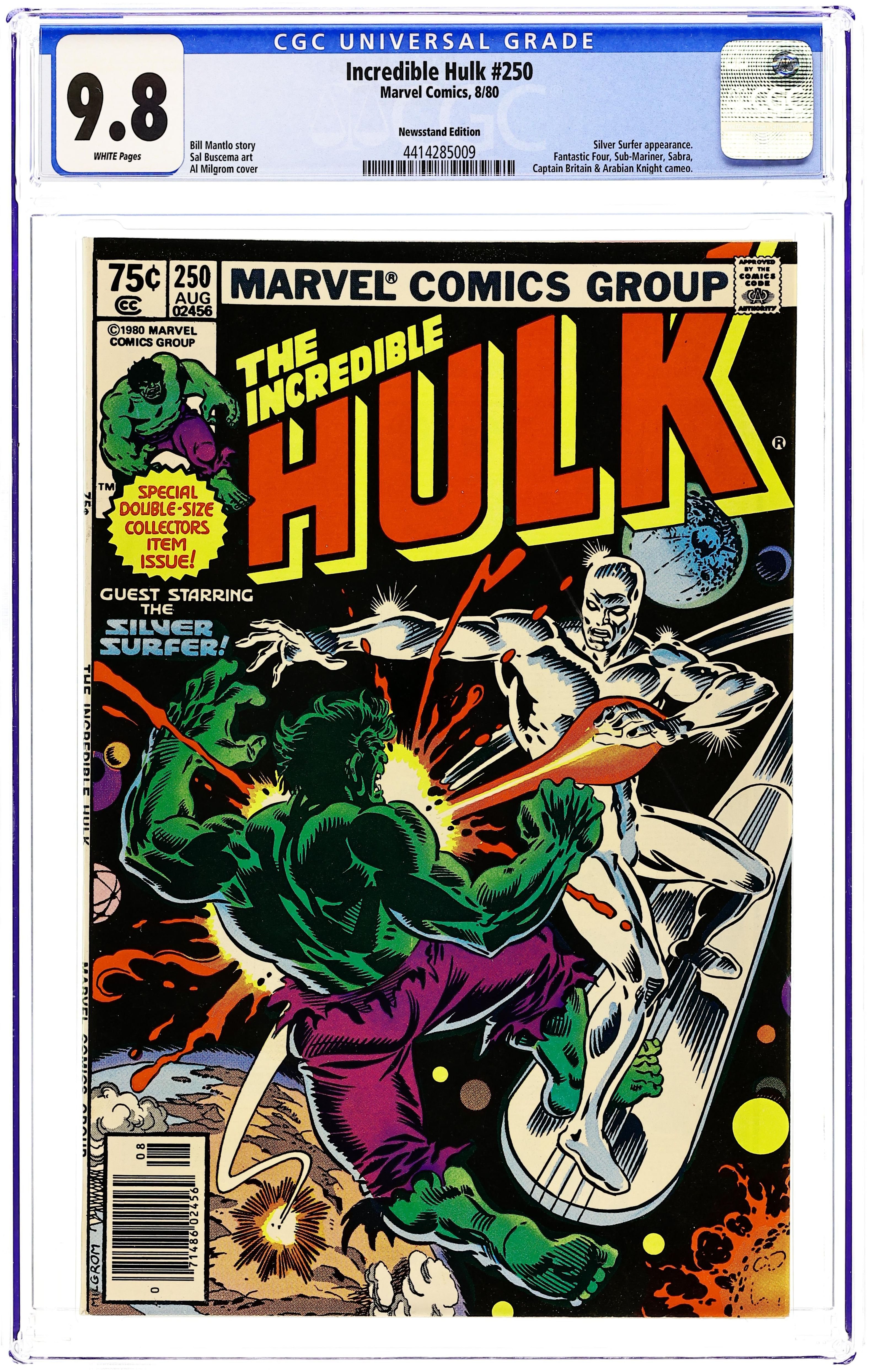 Newsstand Edition. Special giant-sized issue. Guest-starring Silver Surfer. A 250th celebration brought to you by Bill Mantlo and Sal Buscema. The Earth trembles when titans clash. It's the nigh unstoppable Incredible Hulk vs. the former Herald of Galactus, the Silver Surfer. Imprisoned on Earth by his former master, the Silver Surfer intends to add the immeasurable power of the Hulk to his own and break the barrier that keeps him from his home Zenn-La and his beloved. The only problem is, the Hulk has never been known for his generosity. 52 pages. Cover price $0.75. Grade: CGC 9.8 explanation of grade Condition: Used (collectible)