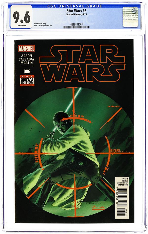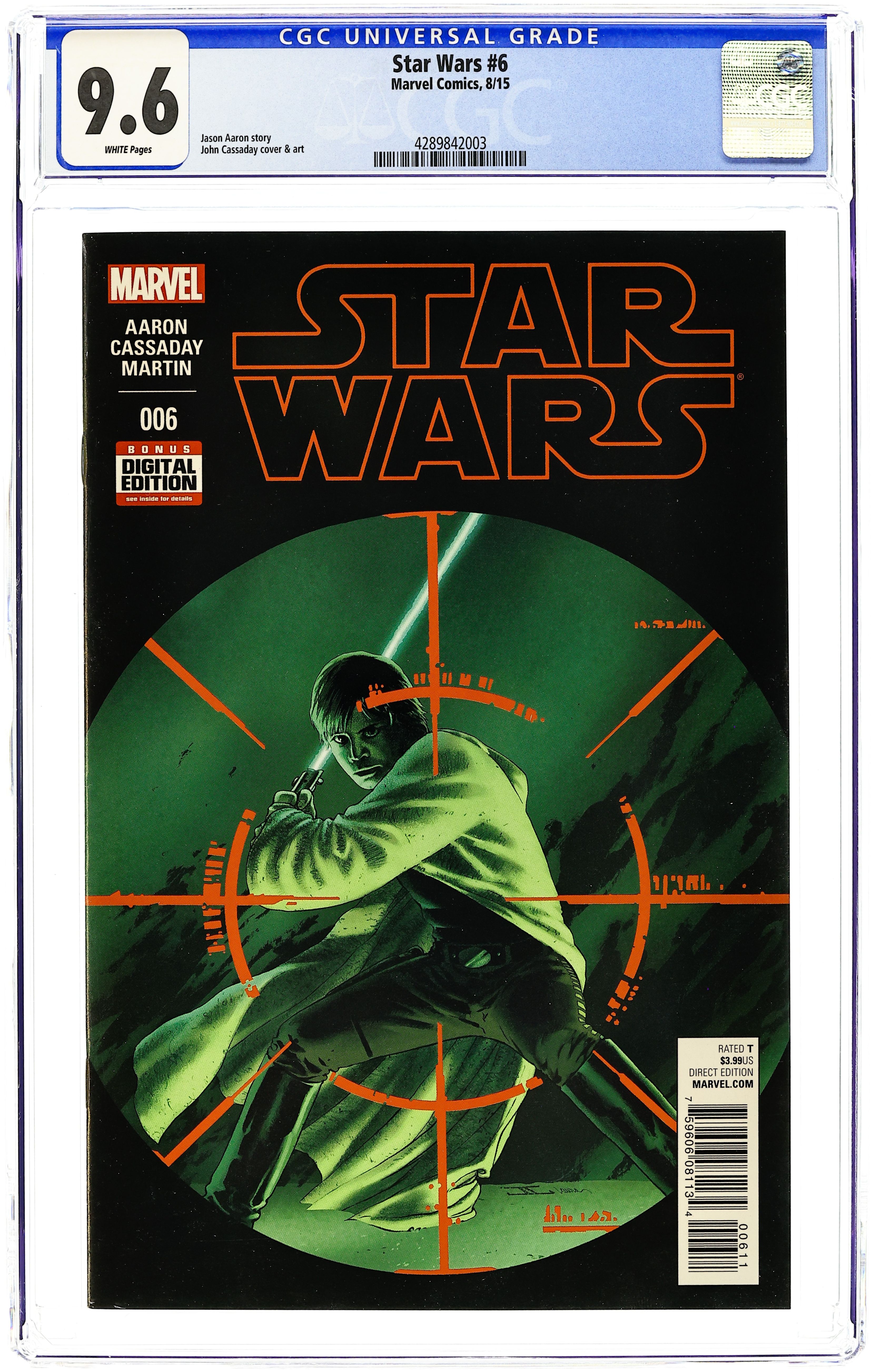 Written by Jason Aaron. Art and Cover by John Cassaday. Luke vs. Boba Fett! Han Solo in hot water! 28 pages, full color. Rated T Star Wars Lucasfilm Ltd. & TM. All rights reserved. Used under authorization. Text and illustrations for Star Wars are 2015 Lucasfilm Ltd. Cover price $3.99. Grade: CGC 9.6 explanation of grade Condition: Used (collectible)