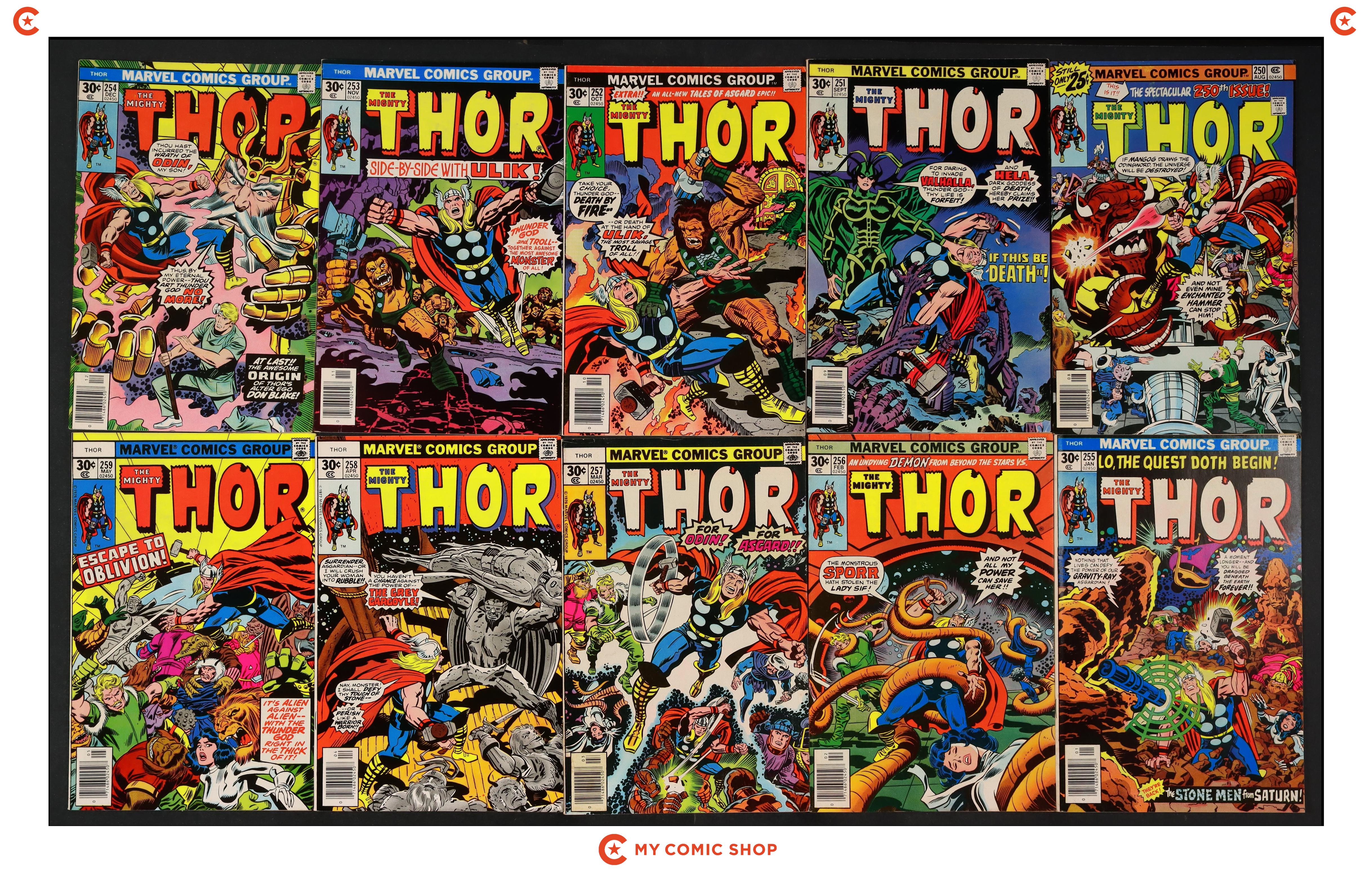 Issues 250-259 of Thor (1962 Marvel 1st Series Journey Into Mystery). Most will grade in the FN to VG range.