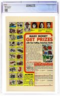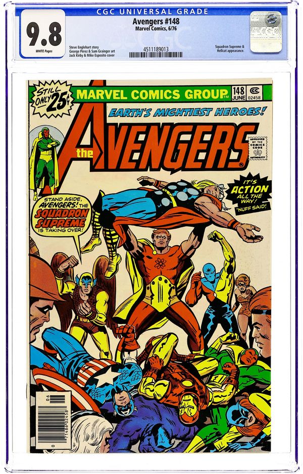 "20,000 Leagues Under Justice!" Part 6 of 7. Script by Steve Englehart. Pencils by George Perez. Inks by Sam Grainger. Cover by Jack Kirby and Mike Esposito. The Avengers' battles against the Squadron Supreme continue in the streets of Other-Earth! On the undercard: Hellcat and the Beast vs. Tom Thumb, Amphibion, and Cap'n Hawk! And the main event: Captain America and Iron Man vs. Doctor Spectrum and the Whizzer! Wow, a sensational action issue! Can Earth's Mightiest Heroes finally defeat the Squadron Supreme and find a way back home? Cameo appearances by Thor, Moondragon, the Wasp, and Yellowjacket. (Notes: Although depicted on the cover, Thor is not with the Avengers on the Squadron's world. The Squadron's Earth was later designated Earth-712. The Squadron Supreme's next adventures take place in Thor 280 and Defenders 112-114. The letters page includes letters from comics historian Peter Sanderson and comics writer Mary Jo Duffy, respectively. A 30-cent cover price variant exists for this issue.) 36 pgs. Cover price $0.25. Grade: CGC 9.8 explanation of grade Condition: Used (collectible)