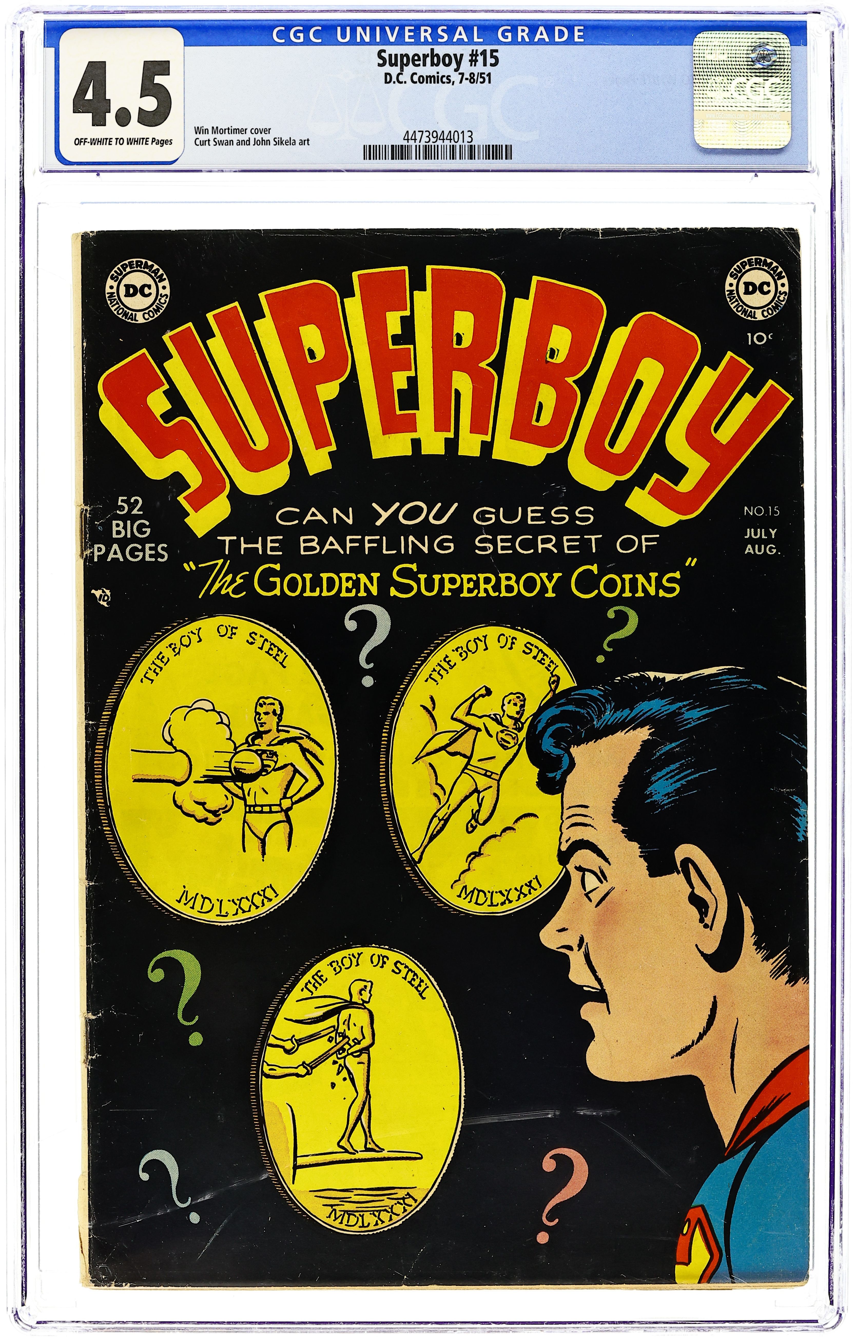 Ended Jul 14 2025 Bid History 17 bids Winning Bid $156 Cover art by Win Mortimer. The Secret of the Golden Coins, pencils by John Sikela, inks by Ed Dobrotka; When Clark and his friends find a pirate treasure chest filled with gold coins with Superboy's picture on them, Superboy flies back to the past to find out how that happened. Clark Kent's Terrible Report Card!, pencils by Curt Swan, inks by John Fischetti; Clark deliberately gets assigned to the "problem kids" class. Play Ball--Superboy's Workshop activity page. Nostradamus biography. Peg humor two-pager by Henry Boltinoff. Superboy's Class Reunion!, pencils by Curt Swan, inks by John Fischetti; Clark visits a reunion of some of his old high school pals; Superboy appears in flashback only. 52 Pages, Full Color. Cover price $0.10. Grade: CGC 4.5 explanation of grade Condition: Used (collectible)