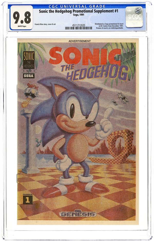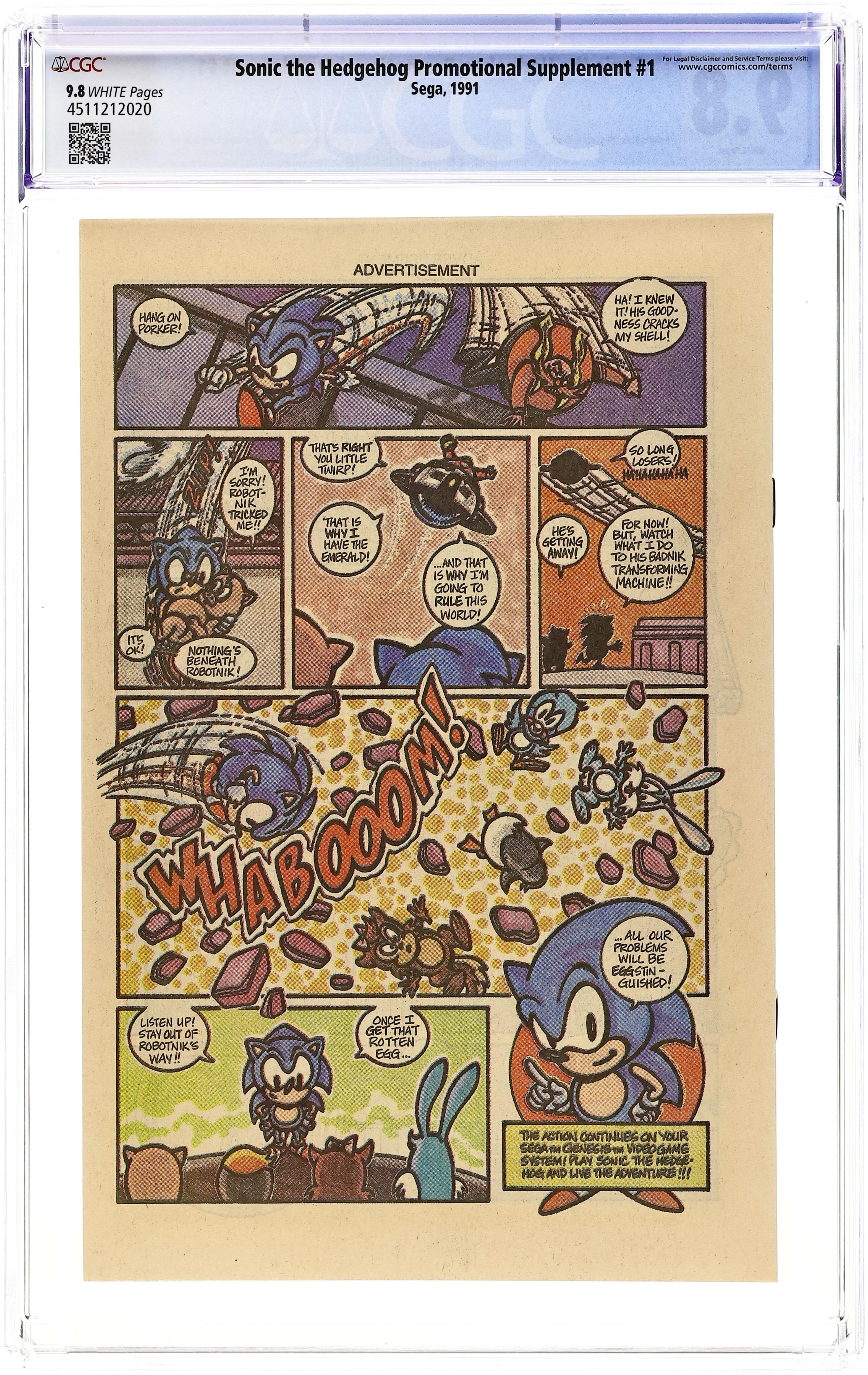 A 6-1/2" x 10" newsprint promotional giveway. Given away with pre-orders for the first Sonic the Hedgehog game, also appears as an insert in Justice League Europe #33. Grade: CGC 9.8 explanation of grade Condition: Used (collectible)