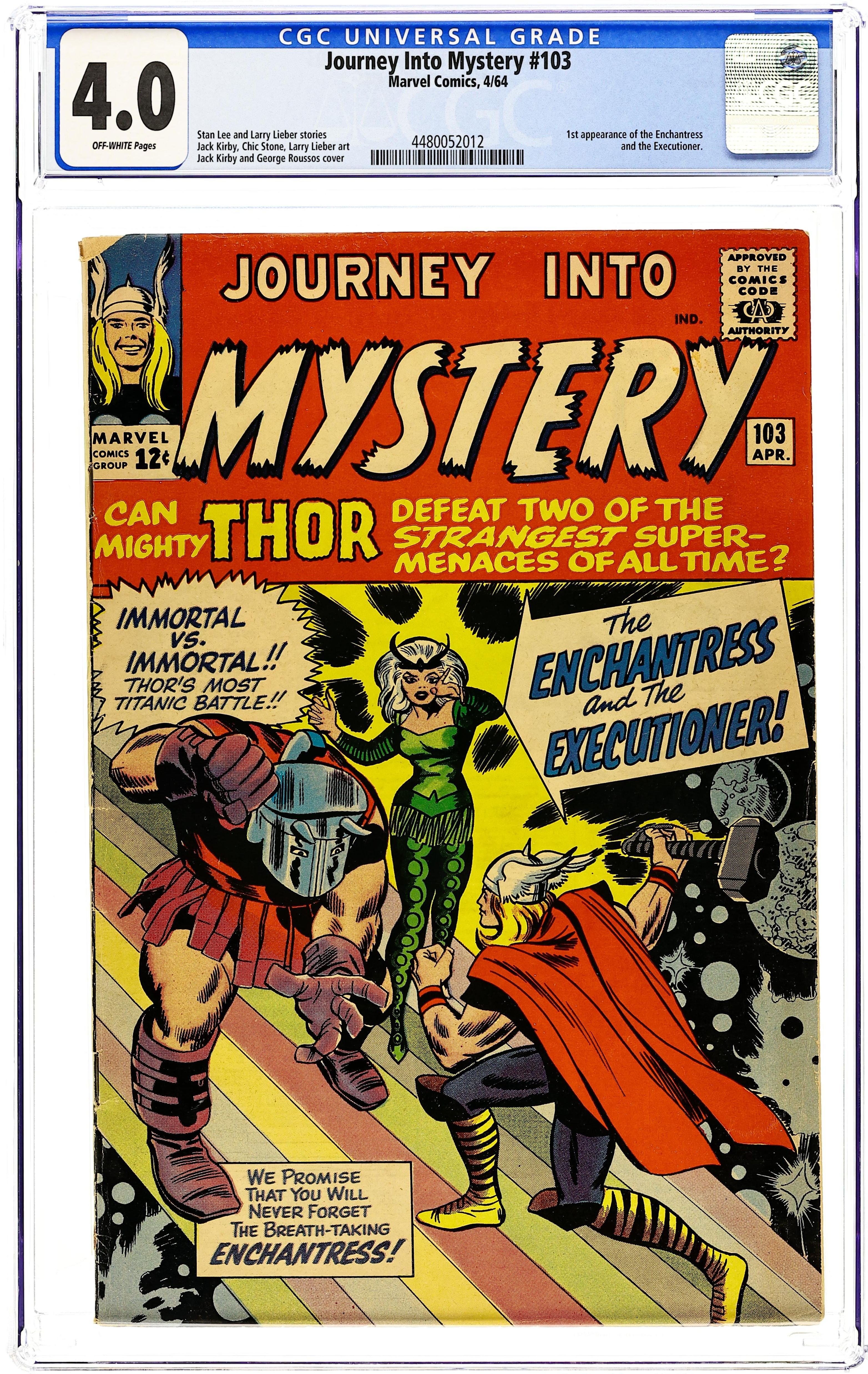 Ended Jun 30 2025 Winning Bid $155 Cover pencils by Jack Kirby, inks by George Roussos. "The Enchantress and the Executioner!", script by Stan Lee, pencils by Jack Kirby, inks by Chic Stone; Loki and Odin conspire to end Thor's infatuation with Jane Foster by sending the Enchantress to seduce him away from his mortal love; The heavy handed Executioner fouls things up and the mission is unsuccessful; features the first appearance of the two title characters. "Poor Oscar" text story. "To Live Forever!", script by Stan Lee (plot) and Larry Lieber (script), pencils by Larry Lieber, inks by Chic Stone; In a future where capital punishment has been abolished, the maximum sentence is 90 years imprisonment; A brilliant scientist decides to find a way to make himself immortal, so he may commit crimes with impunity, but turns himself into a rock. This issue also has a statement of ownership: average print run 318,413; average paid circulation 187,740. "Thor's Mission to Mirmir!", script by Stan Lee, pencils by Jack Kirby, inks by Chic Stone; Thor must reach Mirmir to tell him that Odin has decided it is time to create the human race. 36 pgs., full color. Cover price $0.12. Grade: CGC 4.0 explanation of grade Condition: Used (collectible)
