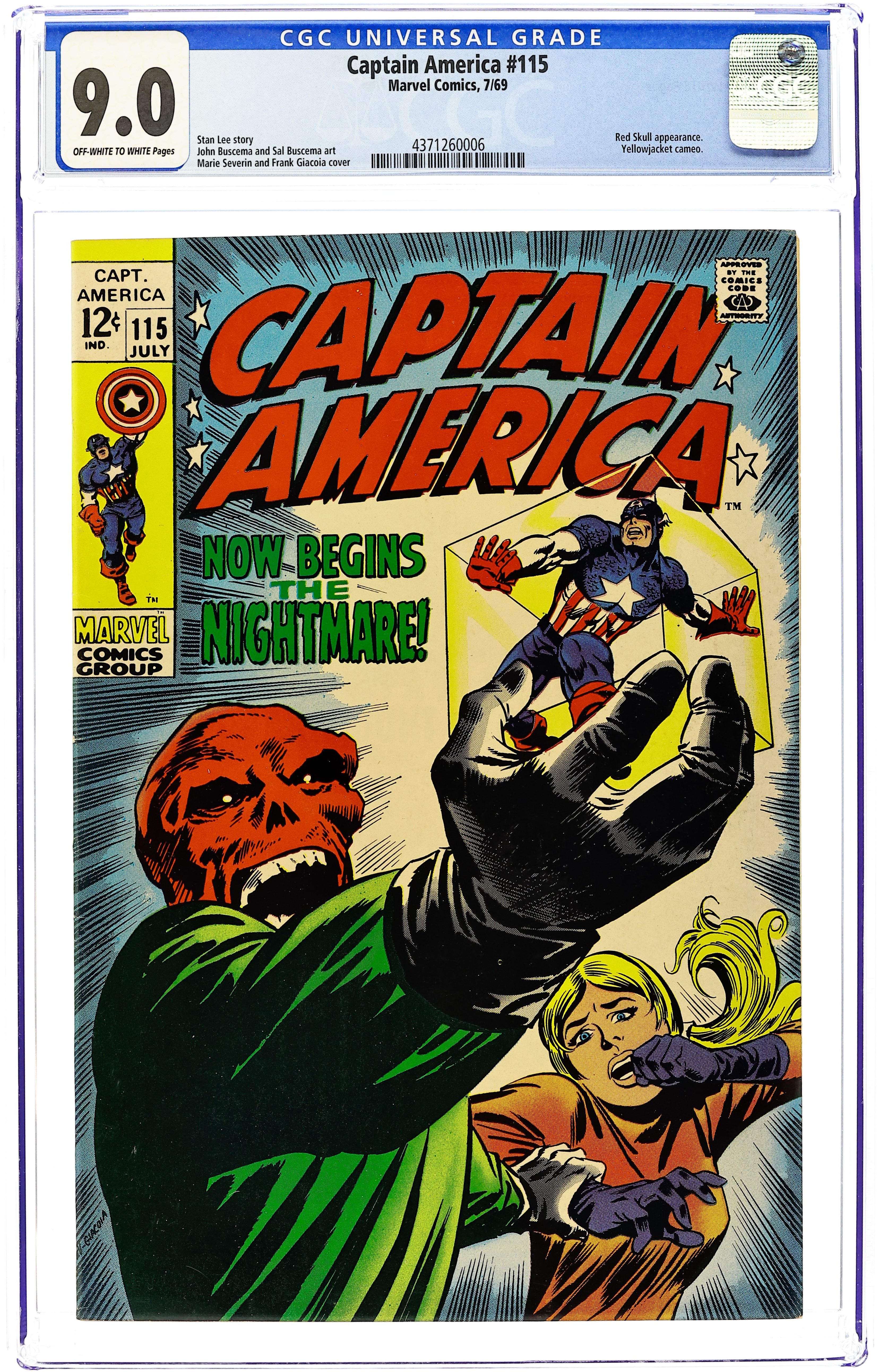 Last 12-cent cover price. Cover pencils by Marie Severin, inks by Frank Giacoia. Using the Cosmic Cube, the Red Skull switches bodies with Captain America in "Now Begins the Nightmare!", script by Stan Lee, pencils by John Buscema, inks by Sal Buscema (Panels 3 and 4 of page 12 retouched by John Romita Sr.); With the Cosmic Cube in his possession, the Red Skull confronts Captain America; Back at SHIELD headquarters, Rick Jones searches for Captain America and asks Sharon Carter if she has seen him; Although she is testing a new SHIELD weapon, Sharon tells Rick that he hasn't seen Captain America since she rejected his request that she leave SHIELD; Rick contacts his old gang of Ham radio enthusiasts, the Teen Brigade, and asks them all to out for Captain America and report back if they see him; Meanwhile, the Red Skull continues using the Cosmic Cube in ways to drive Captain America insane, hurtling him from this realm to different worlds and shrinking him down in size. 36 pgs., full color. $0.12. Cover price $0.12. Grade: CGC 9.0 explanation of grade Condition: Used (collectible)