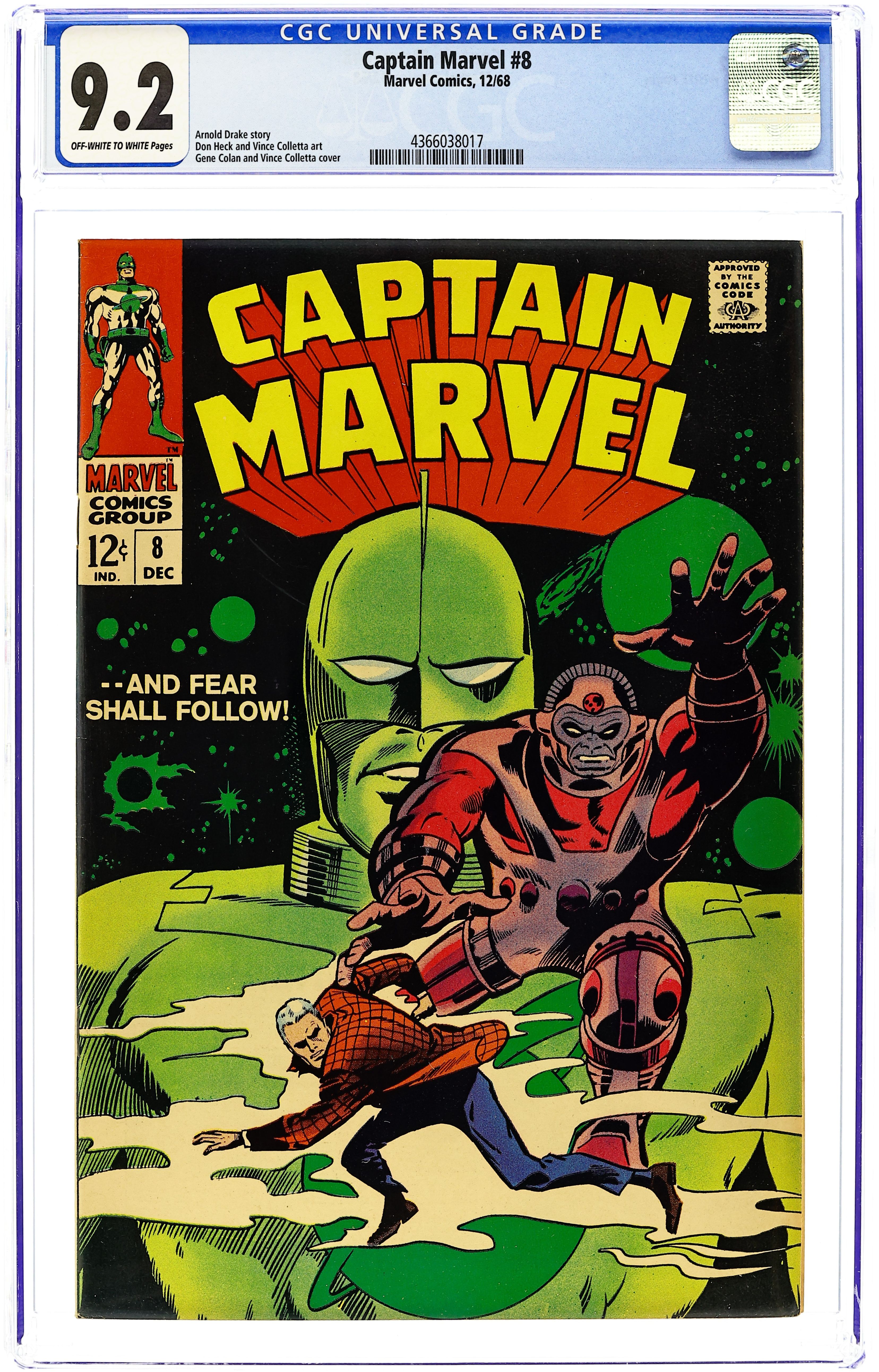 Cover pencils by Gene Colan, inks by Vince Colletta. "And Fear Shall Follow!", script by Arnold Drake, pencils by Don Heck, inks by Vince Colletta; When a trading vessel piloted by members of the Aakon race, they detect a Kree vessel in proximity to the planet Earth; As age old enemies of the Kree, the Aakon decide to land on the dark side of the moon to avoid detection; However, their effort proves too late and Yon-Rogg orders his men to attack the Aakon, in spite of Mar-Vell's warnings that it wouldn't be a good idea; During the battle on the Moon, Yon-Rogg is injured in combat, and Mar-Vell is forced to kill the Aakon leader in order to save his superior, and both parties flee the scene of the battle; Mar-Vell assumes temporary control of the Kree vessel while Yon-Rogg is injured, however he soon returns to Earth; On Earth, Mar-Vell decides to investigate the home of the late Walter Lawson to turn up clues about the man's past, partially for Carol Danvers, and partially for his own curiosity. When he finds a secret lab where something big and humanoid is being constructed, Mar-Vell is attacked by members of the Organization, who had commissioned Lawson to build a robot to be their perfect assassin for them. 36 pgs., full color. Cover price $0.12. Grade: CGC 9.2 explanation of grade Condition: Used (collectible)