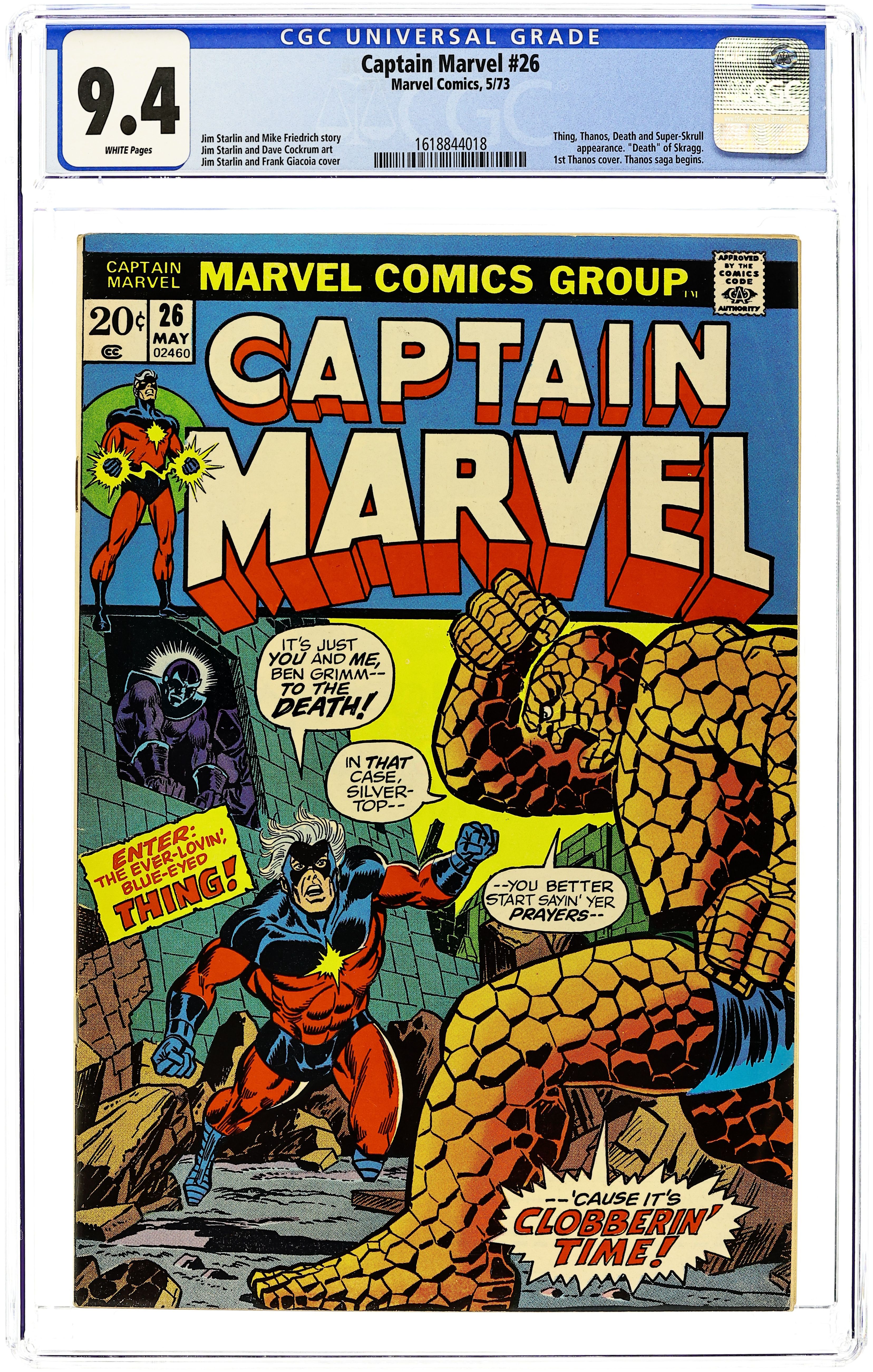 Cap battles the Thing (of the Fantastic Four) in "Betrayal!" Script by Mike Friedrich, plot and pencils by Jim Starlin, inks by Dave Cockrum. Second appearance of Thanos (2 pages). 1st appearance of Death with Thanos. Super-Skrull appearance. Letter to the editor from writer Michael Uslan. Starlin cover pencils. Cover price $0.20. Grade: CGC 9.4 explanation of grade Condition: Used (collectible)