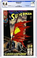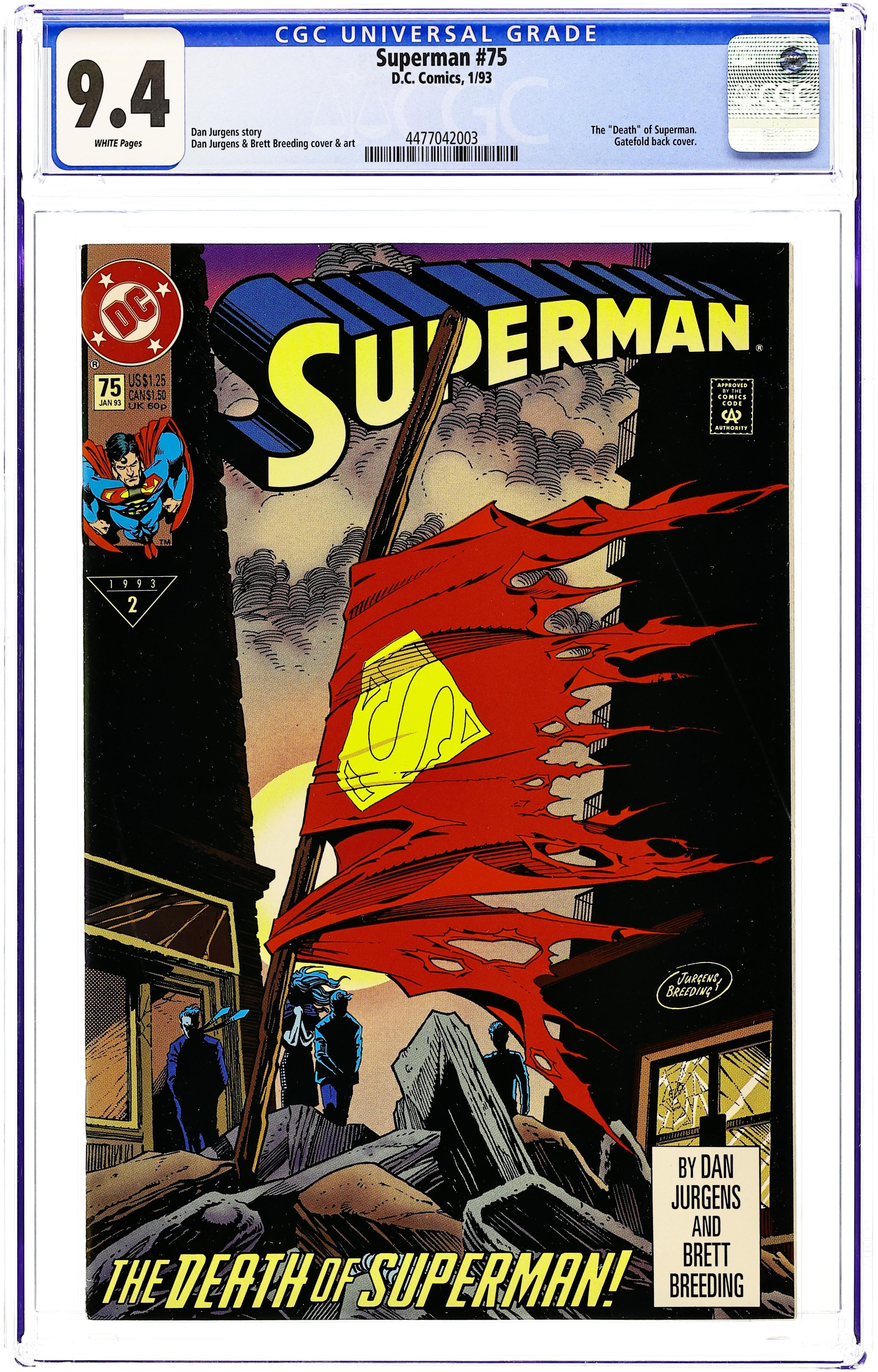 1st printing. Doomsday! Part 7 of 7. "Doomsday!" Story by Dan Jurgens. Art by Dan Jurgens and Brett Breeding. Here it is, the issue that rocked the DC Universe. An unstoppable force named Doomsday crash landed on Earth and has cut a swath of death and destruction across the country, all the way to Metropolis. Even the Justice League, the world's premiere super-team, was powerless before this creature's might. Now one man stands defiantly in Doomsday's way and vows that the creature's insanity stops here. Superman fights his strongest opponent to the death in the streets of Metropolis. Cover price $1.25. Grade: CGC 9.4 explanation of grade Condition: Used (collectible)