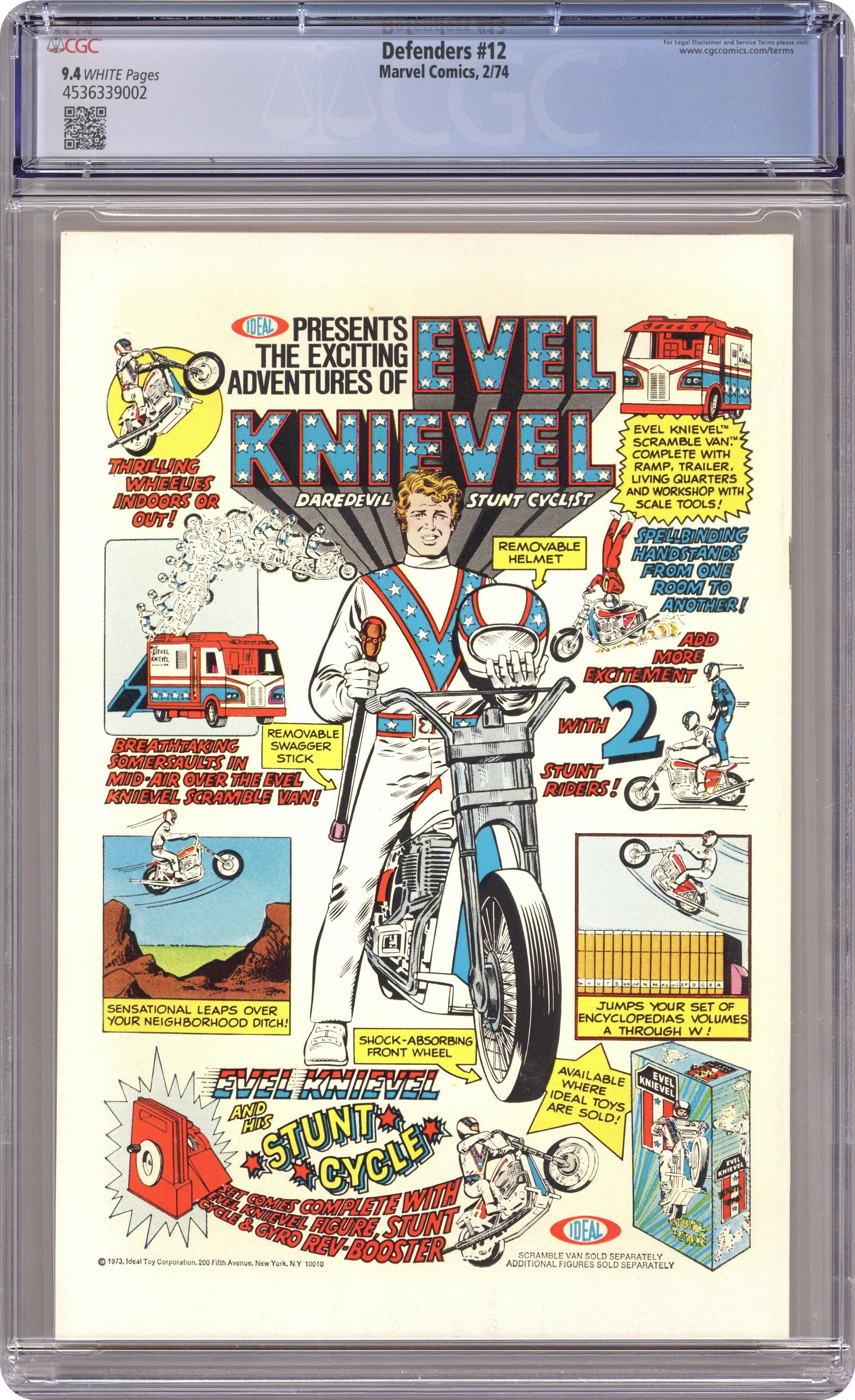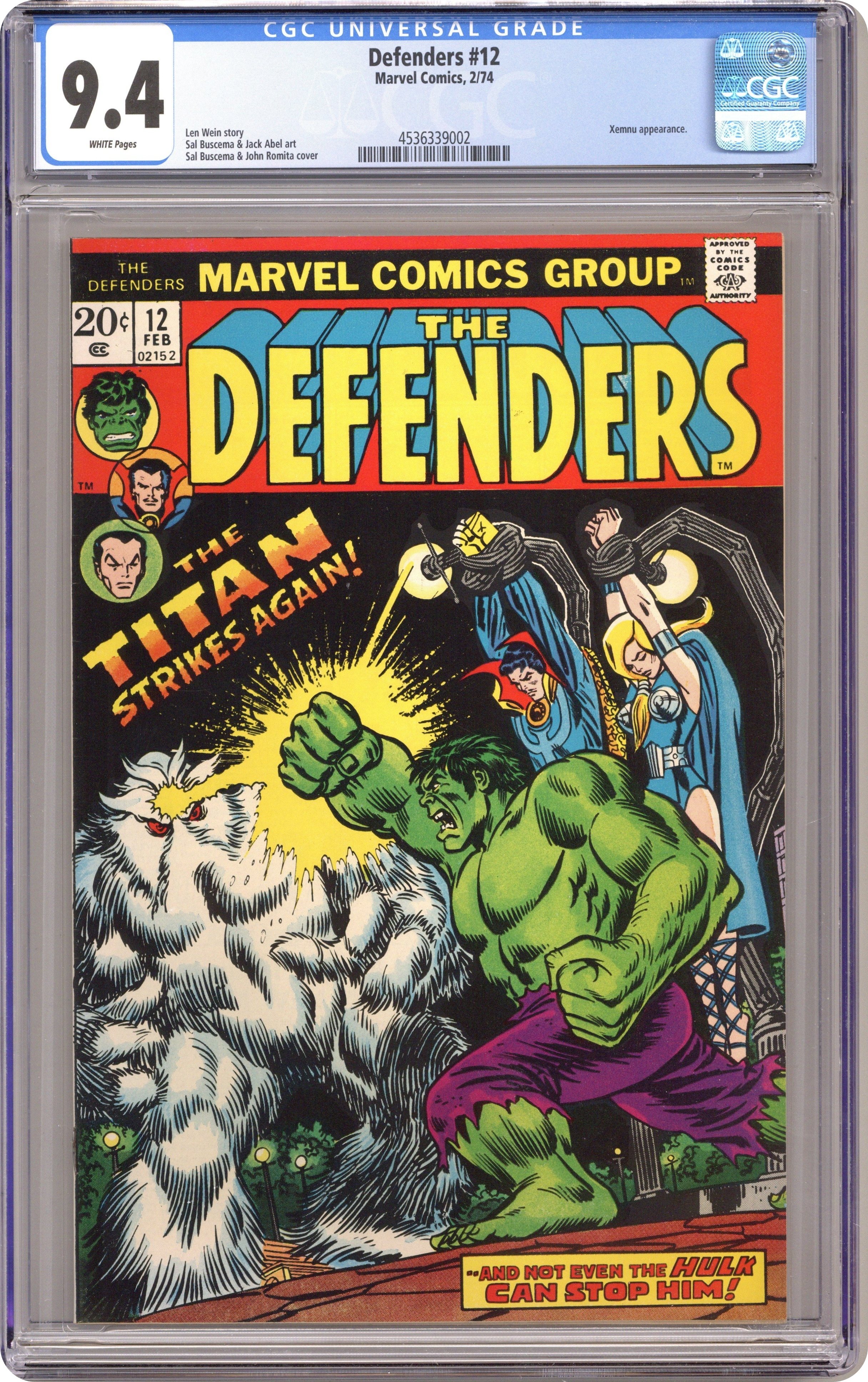 Last 20-cent cover price. Cover art by John Romita. The Titan Strikes Back!, script by Len Wein, pencils by Sal Buscema (layouts) and Jack Abel (finished art), inks by Jack Abel; Xemnu the Titan returns and takes over a small town before being stopped by the Defenders. 36 pgs. $0.20. Cover price $0.20. Grade: CGC 9.4 explanation of grade Condition: Used (collectible)