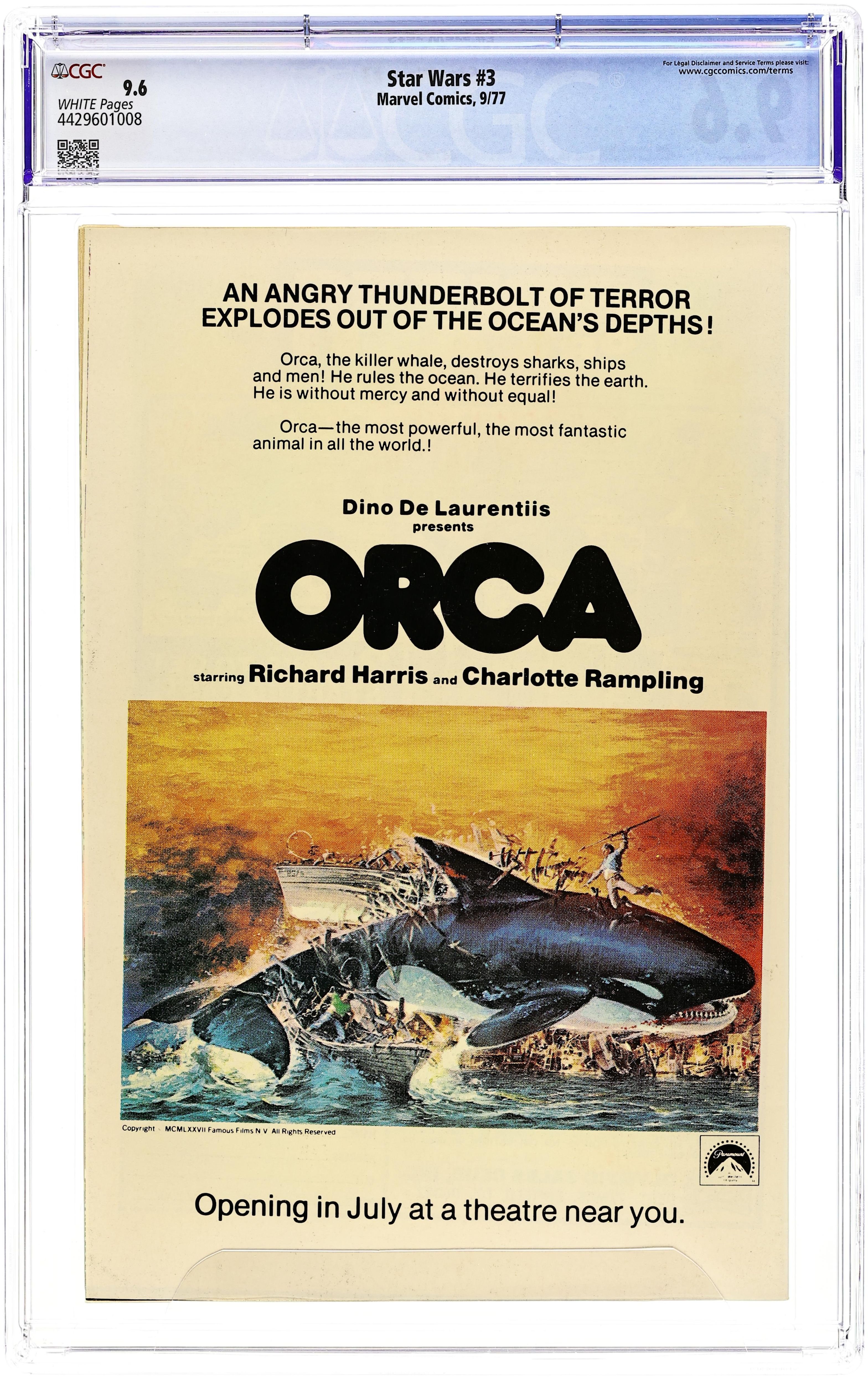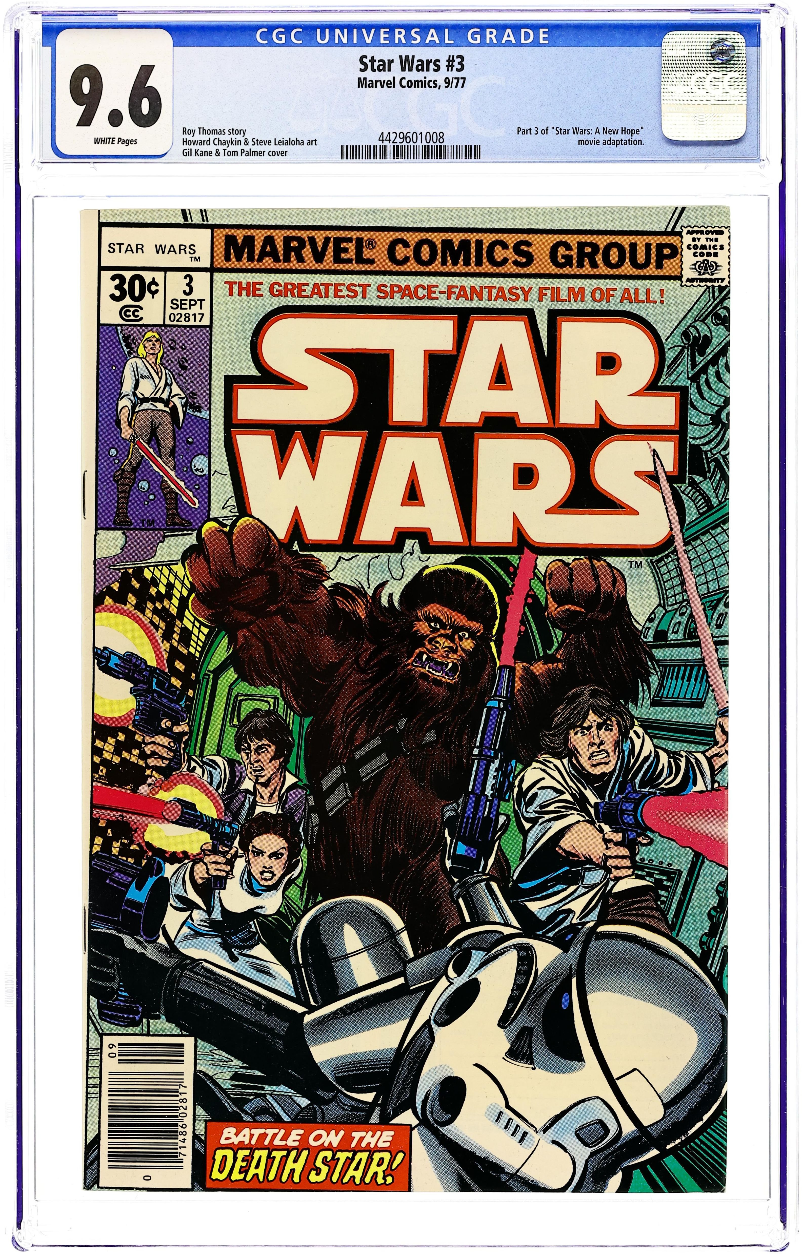 1st printing, standard 30 Cent Newsstand Edition with UPC. A New Hope: Part 3 of 6. "Death Star!" Based on the screenplay by George Lucas. Adapted by Roy Thomas. Art by Howard Chaykin and Steve Leialoha. The evil Galactic Empire tests its ultimate weapon on Princess Leia's homeworld with devastating results. Meanwhile, Ben Kenobi begins Luke Skywalker's training in the ways of the force. However things take a turn for the worse when the Millennium Falcon is captured within the unrelenting grasp of the Death Star's tractor-beam. Now, it's up to this small motley band of heroes to mount a daring rescue attempt of the Princess from within the very bowels of the Empire's most powerful weapon. Cover price $0.30. Grade: CGC 9.6 explanation of grade Condition: Used (collectible)