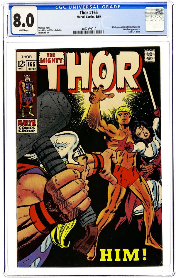 Last 12-cent cover price. Cover pencils by Jack Kirby, inks by Vince Colletta. First full appearance of Adam Warlock in "Him!", script by Stan Lee, pencils by Jack Kirby, inks by Vince Colletta; Balder continues to resist the feminine wiles of Karnilla, and the Norn Queen calls in reinforcements; Meet Haag, a morally-dubious sorceress who has mastered the power of persuasion; Will Balder cave to the sinister love of Karnilla?; Plus, Thor encounters a strange earthling who goes only by the name of "Him." Appearances by Sif and the Watcher. 36 pgs., full color. $0.12. Cover price $0.12. Grade: CGC 8.0 explanation of grade Condition: Used (collectible)