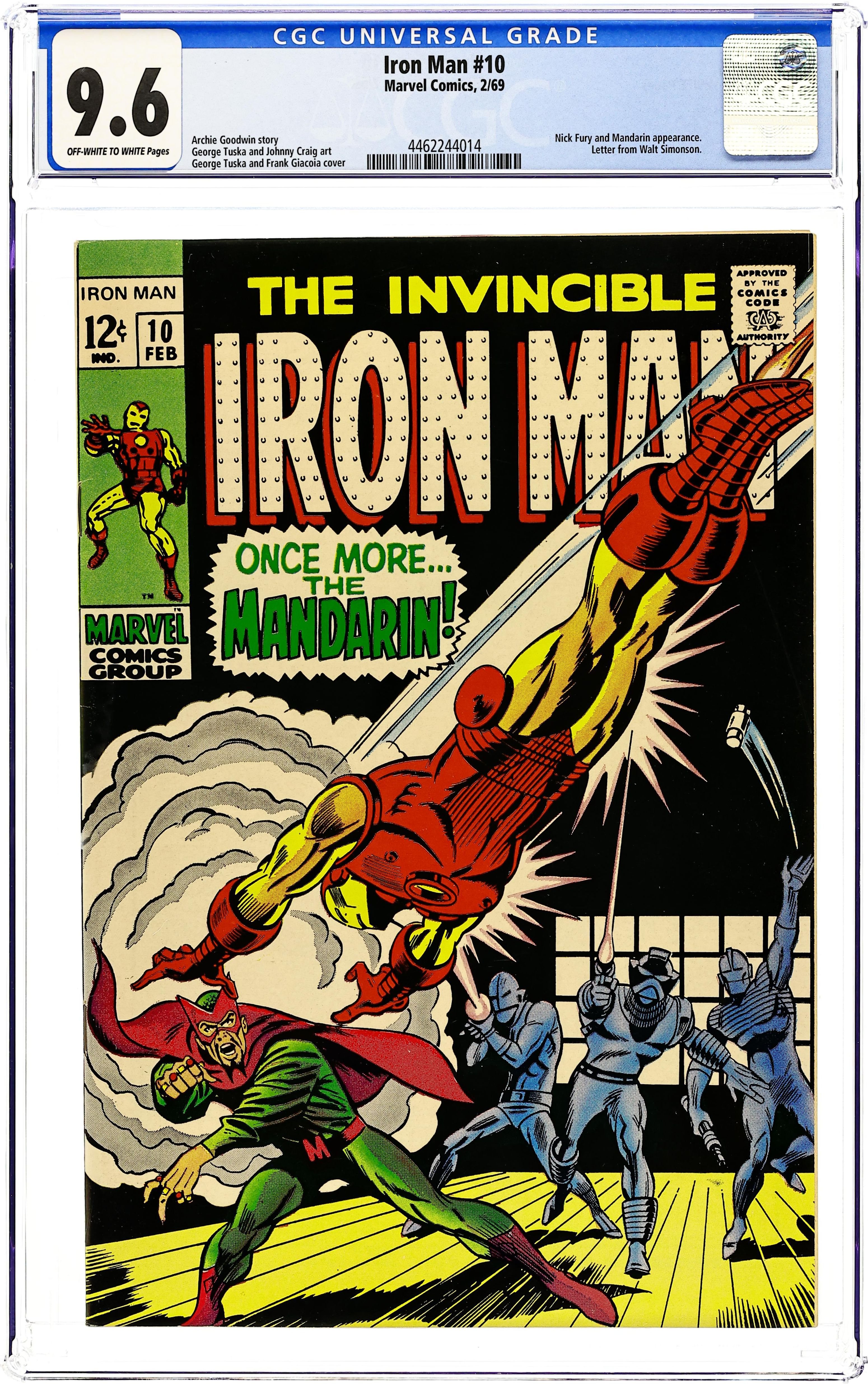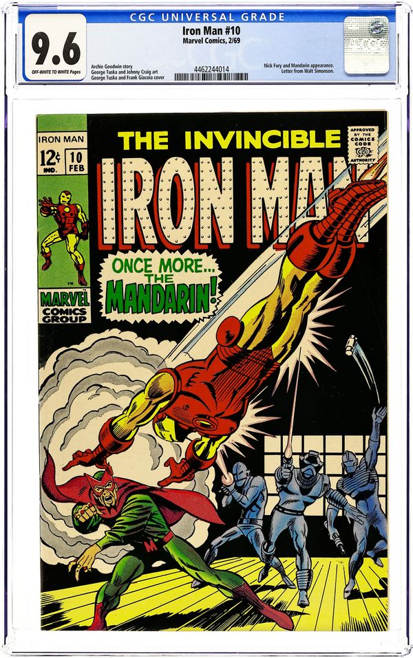 The Mandarin guests in "Once More...the Mandarin!" Part 2 of 3. Script by Archie Goodwin. Pencils by George Tuska. Inks by Johnny Craig. Cover by George Tuska. The Mandarin has discovered that Tony Stark is Iron Man! And now Shell-head's old foe is planning to ruin Stark Industries by linking Tony to communist activity, and thus forcing the U.S. government to cancel Stark Industries' military contracts. How is the golden avenger going to clear his name and then defeat the villain with the ten rings? Cameo appearance by Nick Fury. (Note: The letters page includes a letter from comics writer and artist Walt Simonson.) 32 pages Cover price $0.12. Grade: CGC 9.6 explanation of grade Condition: Used (collectible)