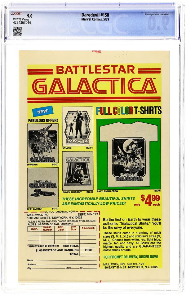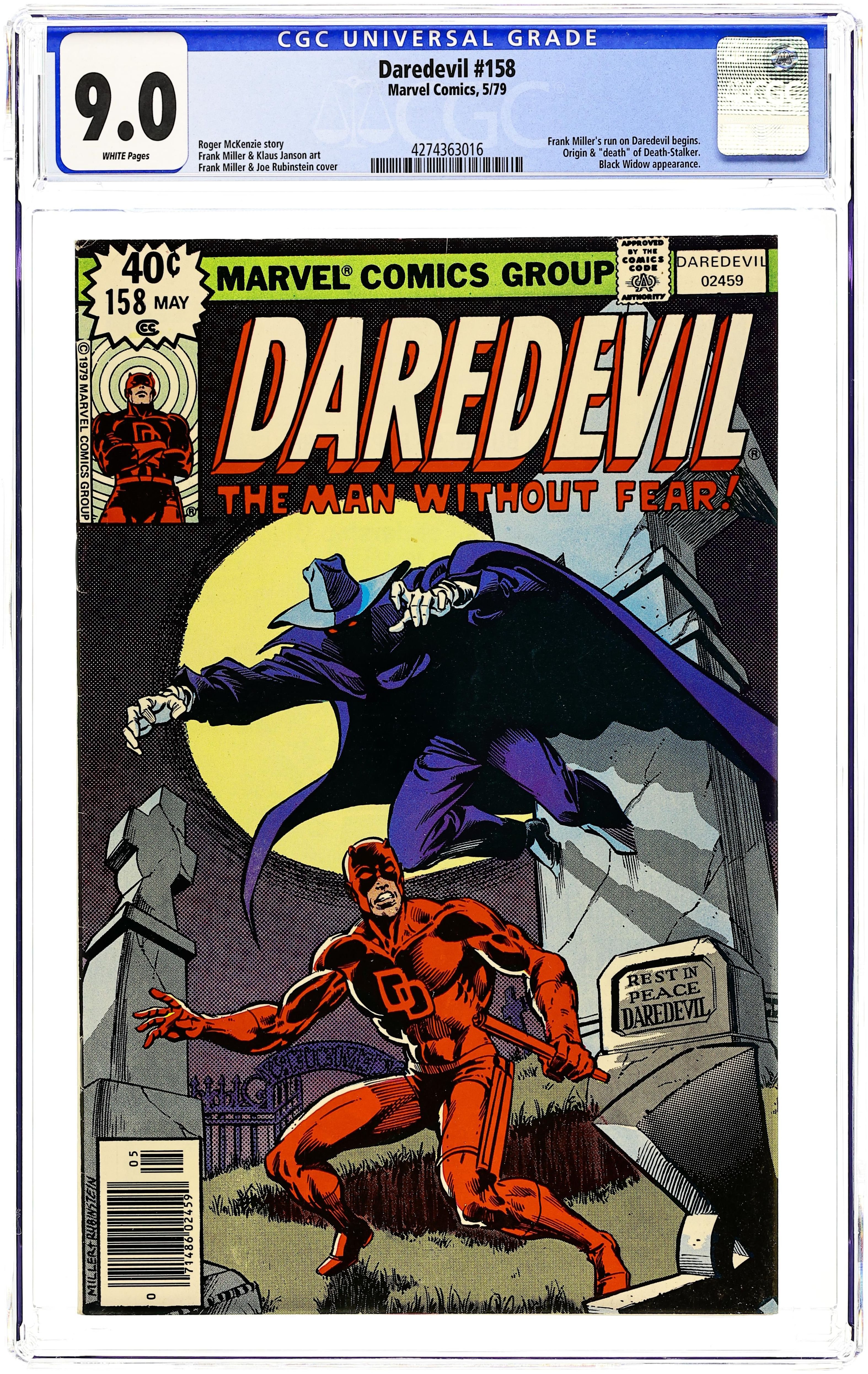First Frank Miller Daredevil. First 40-cent cover price. Cover pencils by Frank Miller, inks by Joe Rubinstein. A Grave Mistake!, script by Roger McKenzie (Death-Stalker origin on page 7 plotted by Marv Wolfman), pencils by Frank Miller , inks by Klaus Janson.; Matt is captured by the Ani-Men and has a final showdown with Death-Stalker in a graveyard; the Unholy Three (Ape Man, Bird Man, Cat Man) appear. This issue contains a statement of ownership--average print run 393,978; average paid circulation 111.559. Miller/Joe Rubinstein cover. 36 pgs. Cover price $0.40. Cover price $0.40. Grade: CGC 9.0 explanation of grade Condition: Used (collectible)