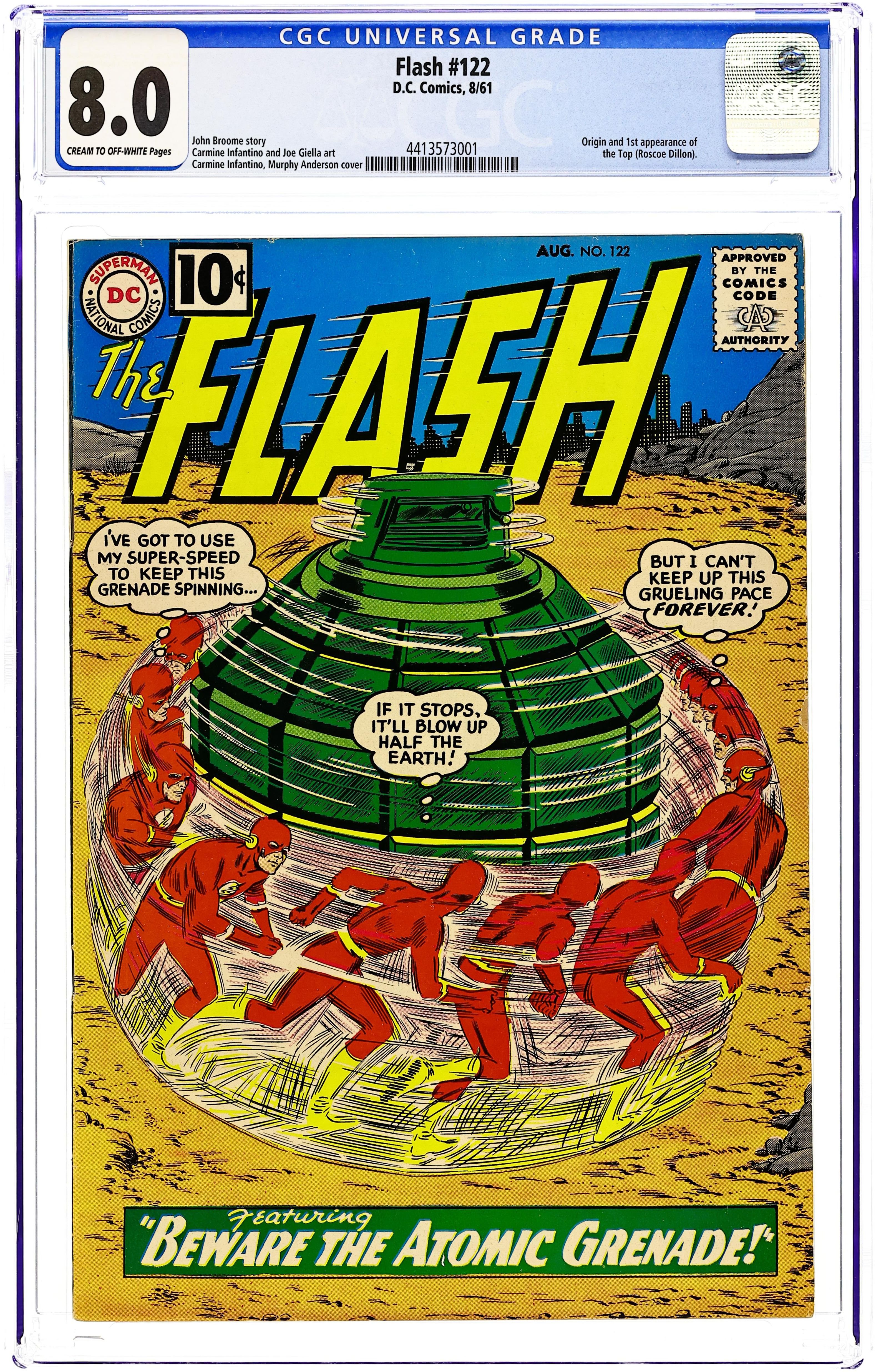 Cover pencils by Carmine Infantino, inks by Murphy Anderson. First appearance of Roscoe "The Top" Dillon in Beware the Atomic Grenade!, script by John Broome, pencils by Carmine Infantino, inks by Joe Giella; Fashion designer Anton Previn gives Iris a make-over while Flash battles a new villain, The Top. Ad for Giant Superman Annual #3. Ad for Special Giant Issue of Secret Origins. Amazing Speeds fact page. Ad for Giant Batman Annual. Letter from super fan Paul Gambaccini. The Face Behind the Mask!, script by John Broome, pencils by Carmine Infantino, inks by Joe Giella; Silver Mask, a boy singer, is being blackmailed by Harry who knows that he used to be part of a gang. 36 Pages, Full Color. Cover price $0.10. Grade: CGC 8.0 explanation of grade Condition: Used (collectible)