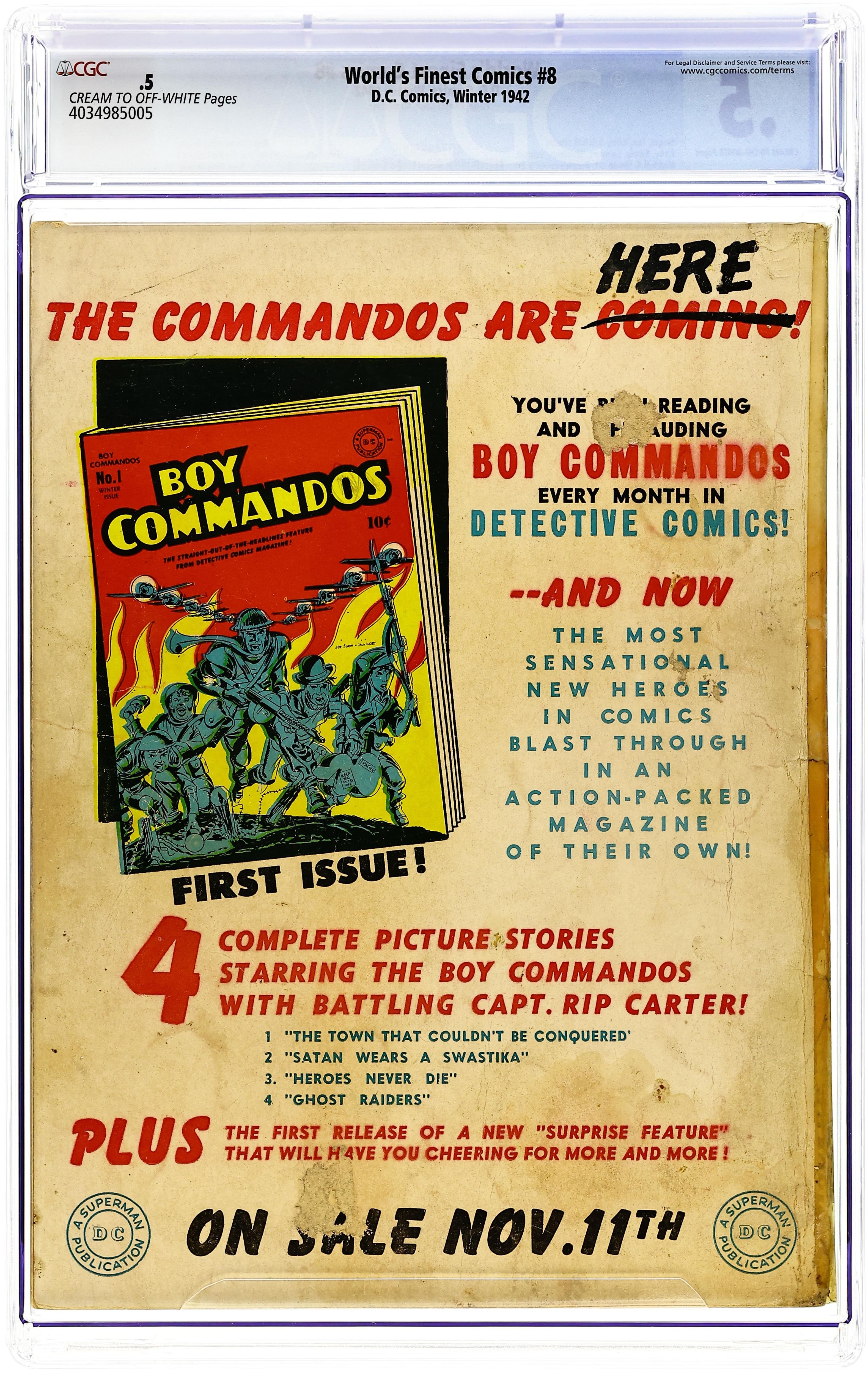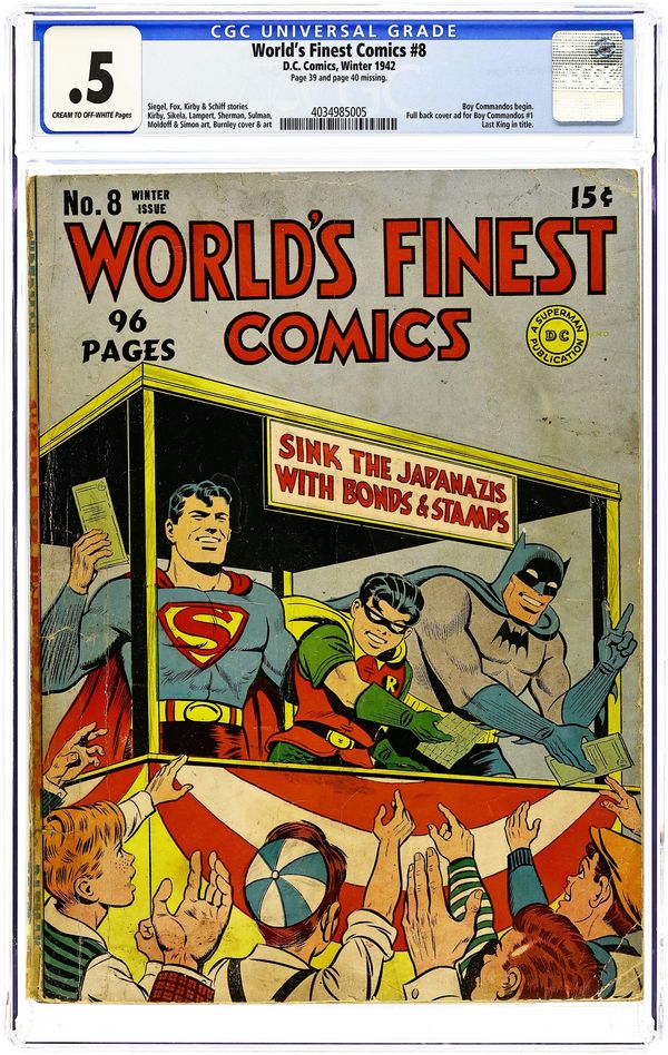Cover art by Jack Burnley. Talent, Unlimited starring Superman, script by Jerry Siegel, pencils by Sam Citron [as Joe Shuster], inks by John Sikela [as Joe Shuster]; Clark Kent is given the assignment by Editor White to find a missing heiress, but along the way manages to help five other people realize their dreams.....as the Man of Steel! Tanks for the Memory starring Drafty, art by Stan Kaye. The Magic Lantern starring Zatara, script by Gardner F. Fox, art by Joseph Sulman. Stripesy, Solo Sleuth Inc. starring The Star-Spangled Kid and Stripesy, script by Jerry Siegel, art by Hal Sherman. Private Pete humor page by Henry Boltinoff. The Luck of the Lepparts starring The Boy Commandos, script by Jack Kirby, pencils by Joe Simon, inks by Jack Kirby. The Unluckiest Man In The World starring The Green Arrow, script by Joseph Green, pencils by Cliff Young, inks by Steve Brodie. A Double For Trouble starring The King, script by Gardner F. Fox, art by Joe Gallagher. Brothers In Law! starring Batman and Robin, script by Jack Schiff, pencils by Jack Burnley [as Bob Kane], inks by Jack Burnley [as Bob Kane] and Ray Burnley (backgrounds); The untimely death of their father leads the O'Brien brothers to attempt to get even with his killer, while working at odds against one another. The Boy Commandos ad, pencils by Jack Kirby, inks by Joe Simon. 100 pages, Full Color. Cover price $0.15. Grade: CGC 0.5 explanation of grade Condition: Used (collectible)