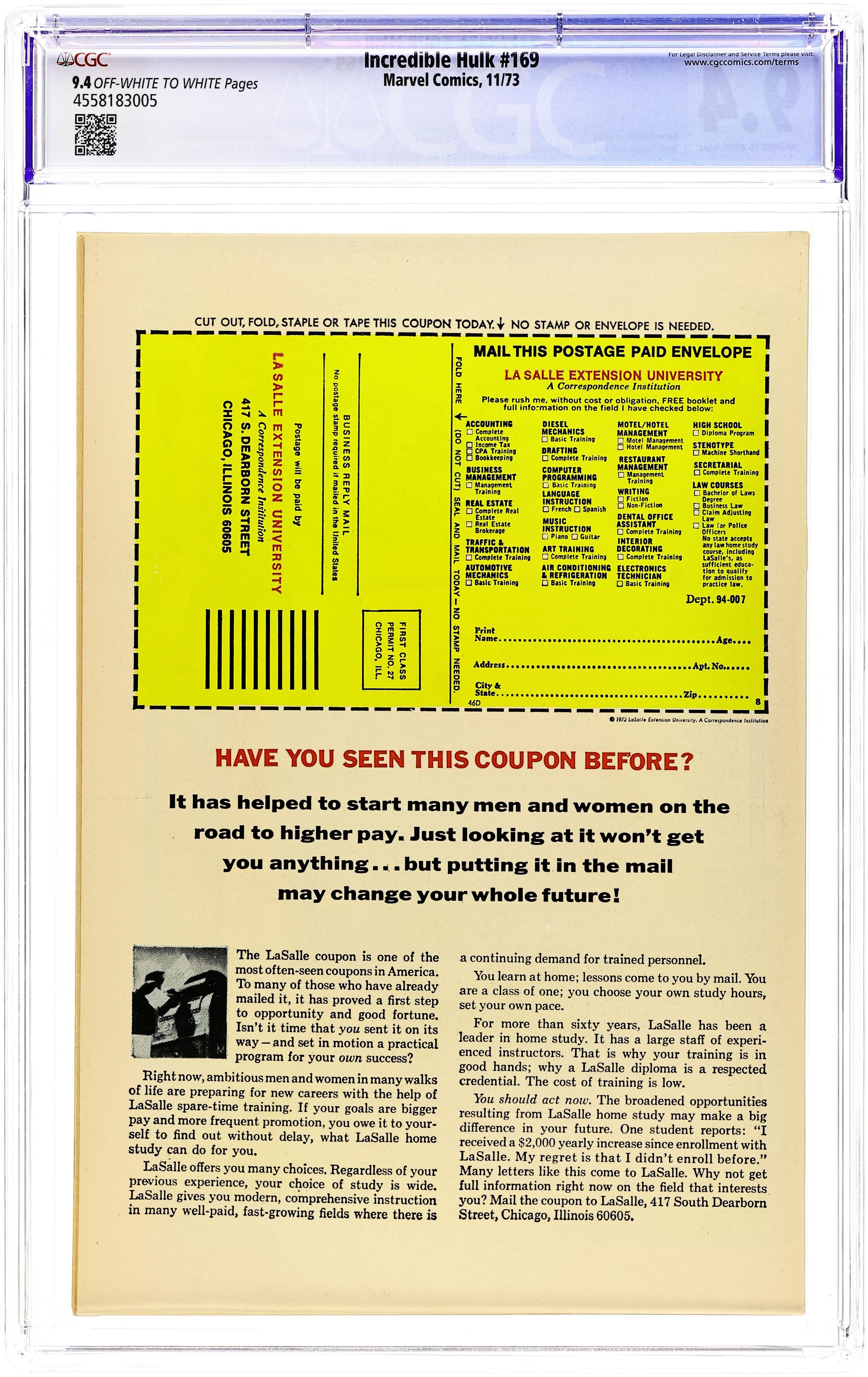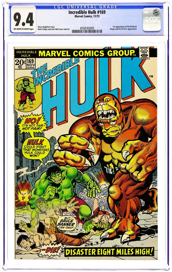 Cover art by Herb Trimpe. Calamity In the Clouds!, script by Steve Englehart, pencils by Herb Trimpe, inks by Jack Abel; The Harpy is flying off with the Hulk when they are both sucked up into a powerful tornado; They find themselves on a floating city and are confronted by its only inhabitant, the Bi-Beast; In the thin atmosphere, the Hulk transforms into Bruce and the Bi-Beast commands him to repair the city's broken down machinery; Instead, he uses the devices he finds to try and turn the Harpy back into Betty; M.O.D.O.K. arrives, takes down the Bi-Beast and decides to claim the city as his own; The Bi-Beast resists and sets the self-destruct; The Harpy turns back into Betty just as the city explodes. 36 pgs. $0.20. Cover price $0.20. Grade: CGC 9.4 explanation of grade Condition: Used (collectible)