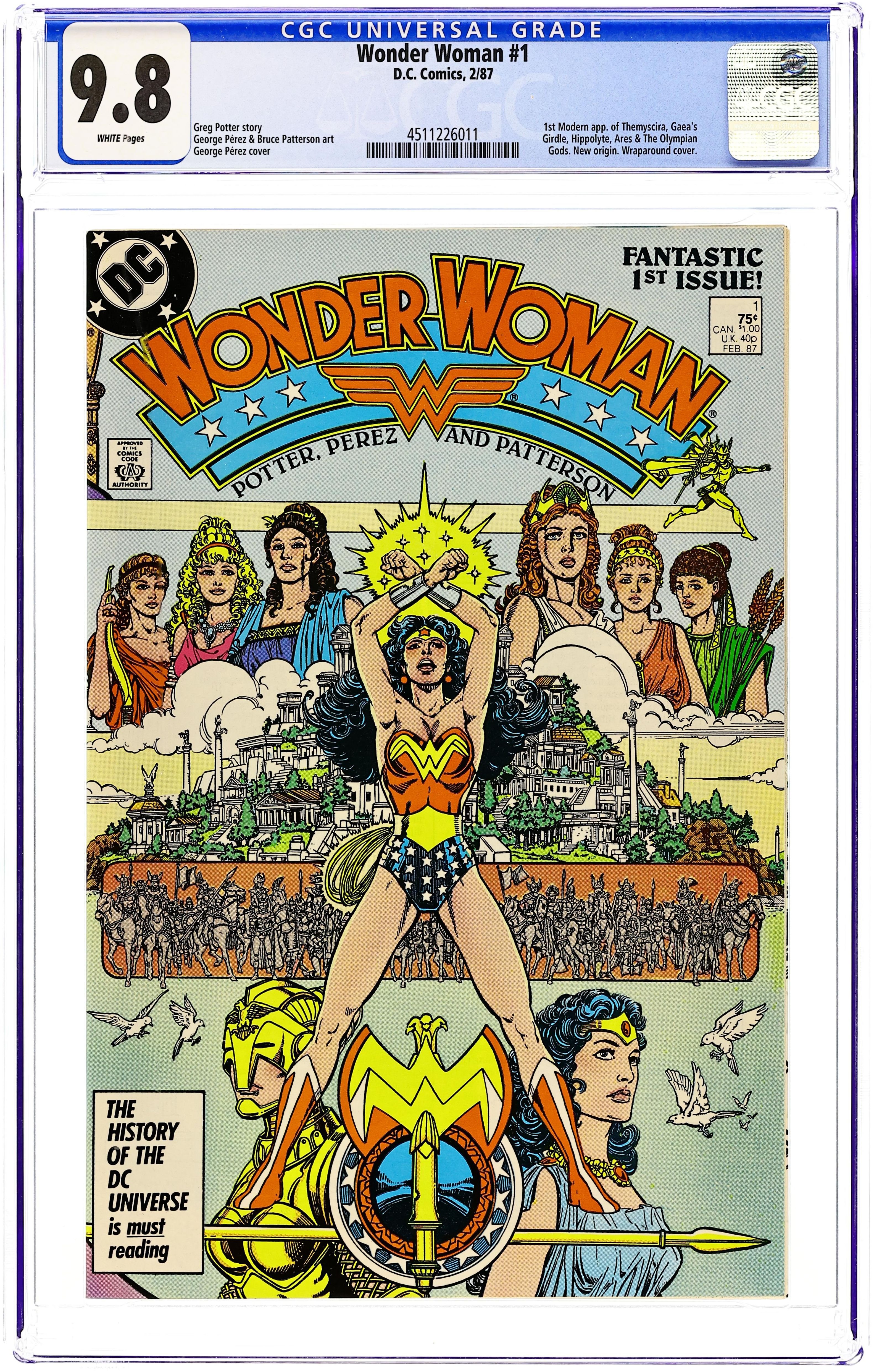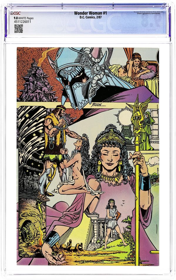 Direct Edition. In this post-Crisis on Infinite Earths re-imagining of the Wonder Woman mythos, Diana is born of clay, growing on Paradise Island to become the champion of the Amazons. "The Princess and the Power!" Part 1 of 6, continued next issue. Script by Greg Potter, co-plot and pencils by George Perez, inks by Bruce Patterson. Perez inks first 2 pages and the final page. Wrap-around cover. No ads. Perez cover. 36 pgs. Cover price $0.75. Grade: CGC 9.8 explanation of grade Condition: Used (collectible)