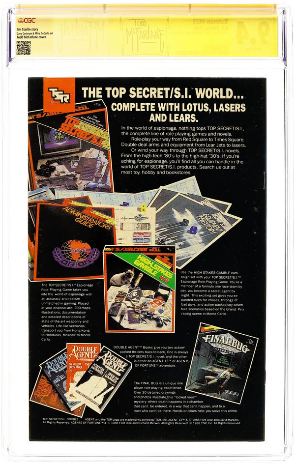 1st Printing. Direct Edition. Three cops relate three tales of the Dark Knight, revealing different facets of Batman's character, in "You Shoulda Seen Him..." Script by Jim Starlin, pencils by Dave Cockrum, inks by Mike DeCarlo. Todd McFarlane cover. 1st printing. NOTE: Most issues from 397-432 were reprinted in 1989 and sold in multipacks. These 2nd and 3rd prints have back cover ads dated 1989. 36 Pages, Full Color. Cover price $0.75. Grade: CGC 9.4 explanation of grade Condition: Used (collectible)