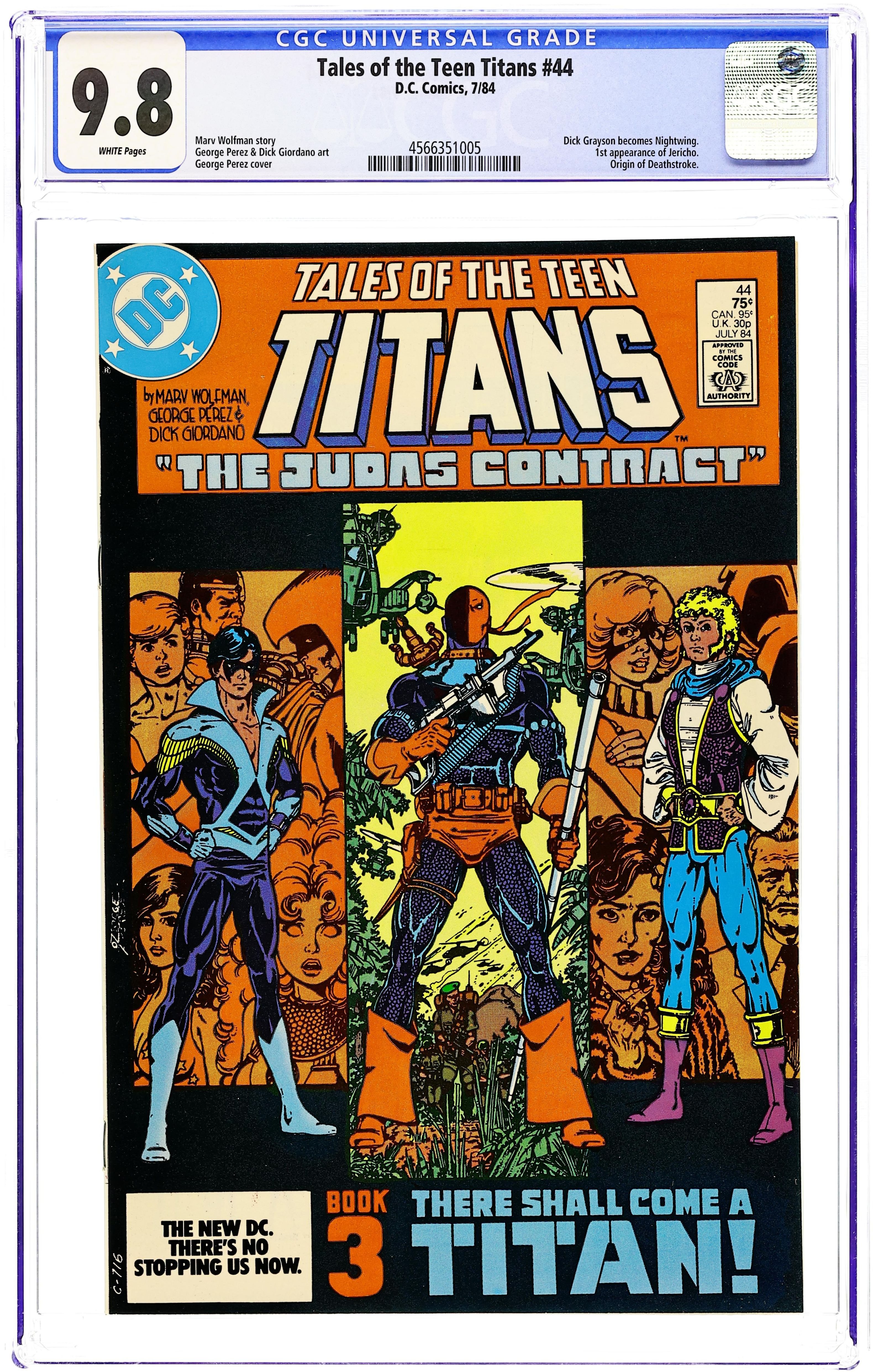Ended Jul 3 2025 Winning Bid $202 Direct Edition. The Judas Contract: Part 3 of 4: There Shall Come a Titan! - Written by Marv Wolfman & George Perez. Art by George Perez, Dick Giordano and Mike DeCarlo. Cover by George Perez. Adeline Wilson tells Dick Grayson of the origin of Deathstroke, and Dick assumes the name Nightwing for the first time! Starring Nightwing (intro), Jericho (intro), Deathstroke the Terminator, Terra, Adeline Wilson, H.I.V.E., Wintergreen, Grant Wilson (flashback/cameo) and Jackal. Concludes in New Teen Titans (1980) Annual #3. 36 pages, full color. Cover price $0.75. Grade: CGC 9.8 explanation of grade Condition: Used (collectible)
