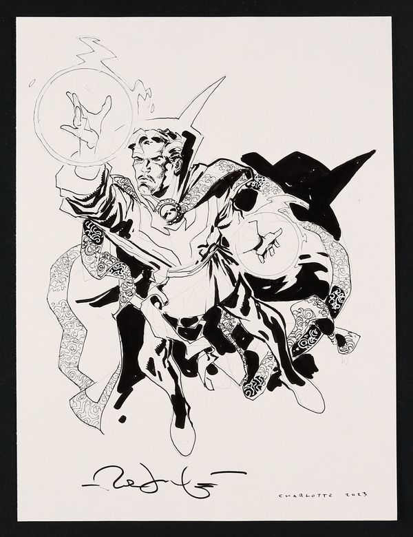 • One of the modern era's great artist, Leonardi turns in a fantastic Dr. Strange here with lively figurework enhanced by perfectly placed heavy inks. Signed by the artist. Pencil and ink on paper. 9" x 12".