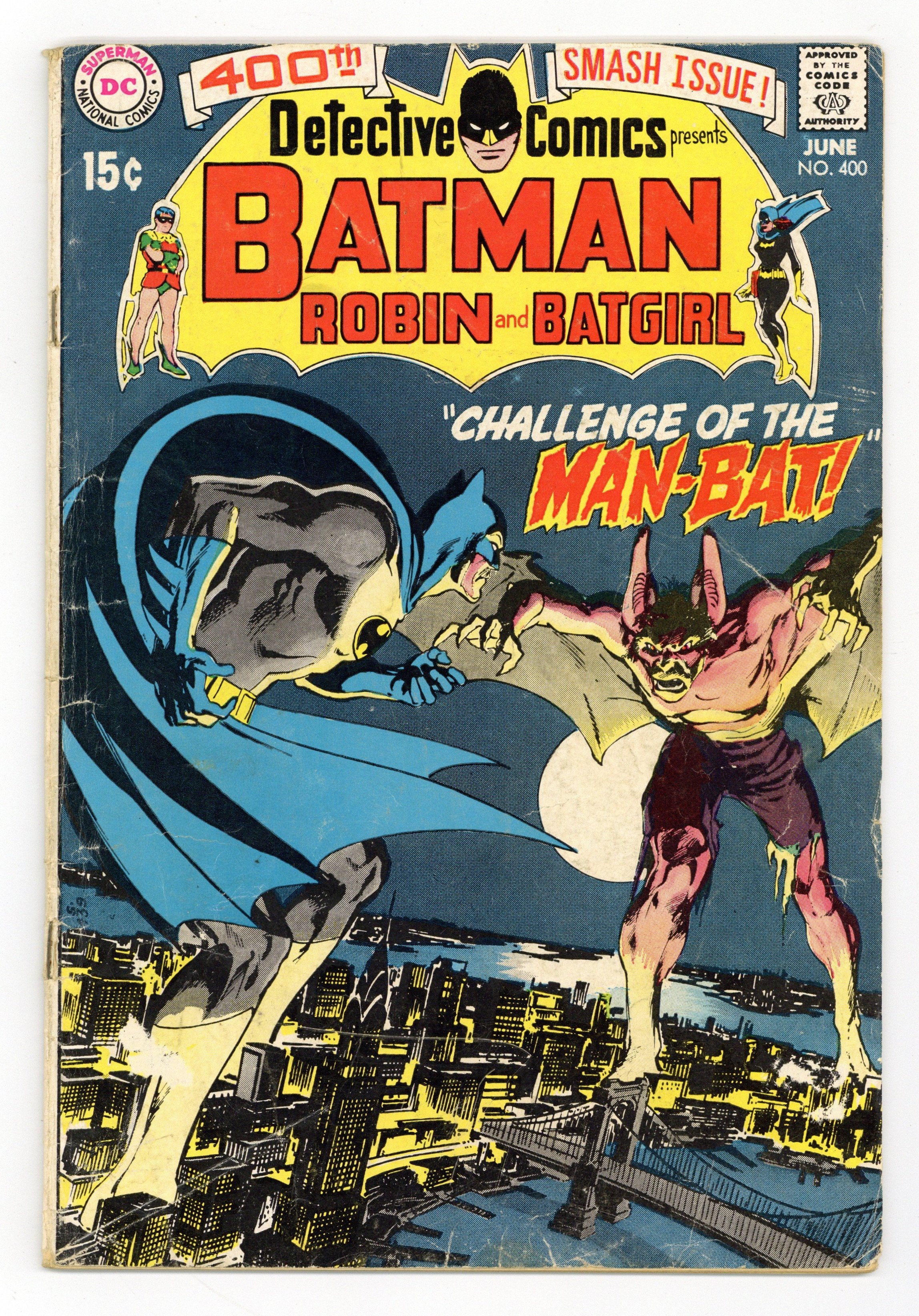 Ended Jul 17 2025 Winning Bid $174 Cover by Neal Adams. Milestone issue featuring 1st appearance of Man-Bat in "Challenge of the Man-Bat!", script by Frank Robbins, pencils by Neal Adams, inks by Dick Giordano; Zoologist Kirk Langstrom is working late at the Gotham Natural History Museum putting together a bat habitat; he aims to perfect a serum that can endow people with enhanced auditory abilities via a specialized bat gland extract; Elsewhere in the city, a group of thieves known as the Blackout Gang break into a vault; Back at the museum, Kirk Langstrom is pleased with his progress and decides to test his new formula upon himself; he mutates into Man-Bat. "A Burial for Batgirl!," script by Denny O'Neil, pencils by Gil Kane, inks by Vince Colletta; Barbara Gordon has come to Hudson University to help with a Edgar Allen Poe festival; She discovers a murder and captures Hank Osher, who appears to be the murderer; Batgirl begins to believe that Hank has been framed and investigates further, which leads to her being captured and bricked into a wall. Letter to the editor from writer Alan Brennert. 36 pgs., full color. $0.15. Cover price $0.15. Grade: GD 2.0 explanation of grade Condition: Used (collectible)