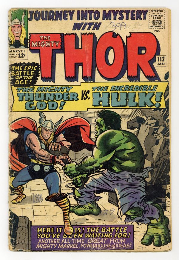 Ended Jun 17 2025 Winning Bid $38 Cover pencils by Jack Kirby, inks by Chic Stone. "The Mighty Thor Battles the Incredible Hulk!", script by Stan Lee, pencils by Jack Kirby, inks by Chic Stone; Two rival fan clubs are debating who is stronger, Thor or the Hulk?; Thor happens to be passing by and drops in to offer his opinion; He relates the story of their epic battle (in Avengers #3) and describes a previously unseen scene in which he and the Hulk tussle; He goes into deep thought and when pressed, cannot say who is the stronger because he has insufficient proof!; Guest appearances by the Avengers (Iron Man, the Sub-Mariner, Giant-Man, and the Wasp) and Odin. "Tales of Asgard" back-up: "The Coming of Loki!", script by Stan Lee, pencils by Jack Kirby, inks by Vince Colletta; The Asgardians battle the Giants. Laufey, King of the Giants of Jotenheim, is slain; A bundle of cloth is found. It contains a baby; Odin adopts the child and names him Loki. The Merry Marvel Marching Society promo. 36 pgs., full color. Cover price $0.12. Grade: PR 0.5 explanation of grade Condition: Used (collectible)