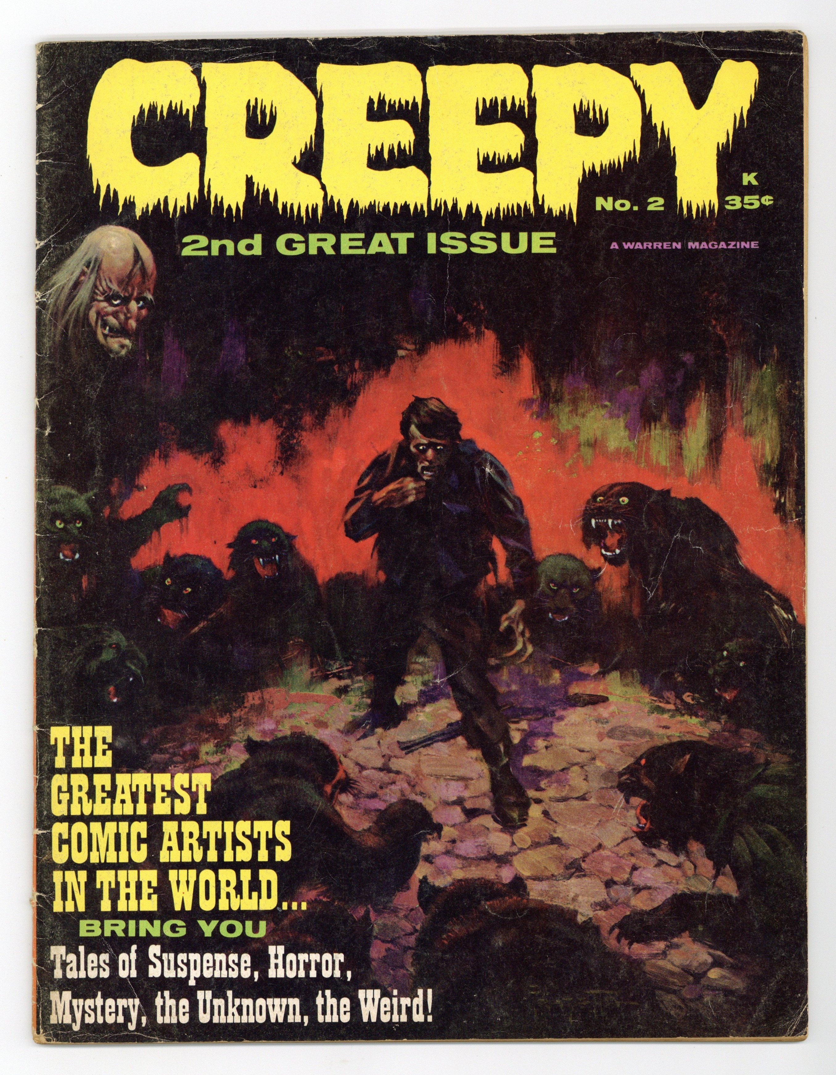 Issue #2. April 1965. Stories in this issue include: Fun and Games! by Archie Goodwin and Joe Orlando; Spawn of the Cat People by Archie Goodwin and Reed Crandall; Wardrobe of Monsters! by Otto Binder, Gray Morrow, and Angelo Torres; Welcome Stranger by Archie Goodwin and Al Williamson; I, Robot by Otto Binder and Joe Orlando; and Ogre's Castle by Archie Goodwin and Angelo Torres. Cover art by Frank Frazetta. 8.25" x 10.75". 48 pages. Black and white. Cover price $0.35. Grade: GD/VG 3.0 explanation of grade Condition: Used (collectible)