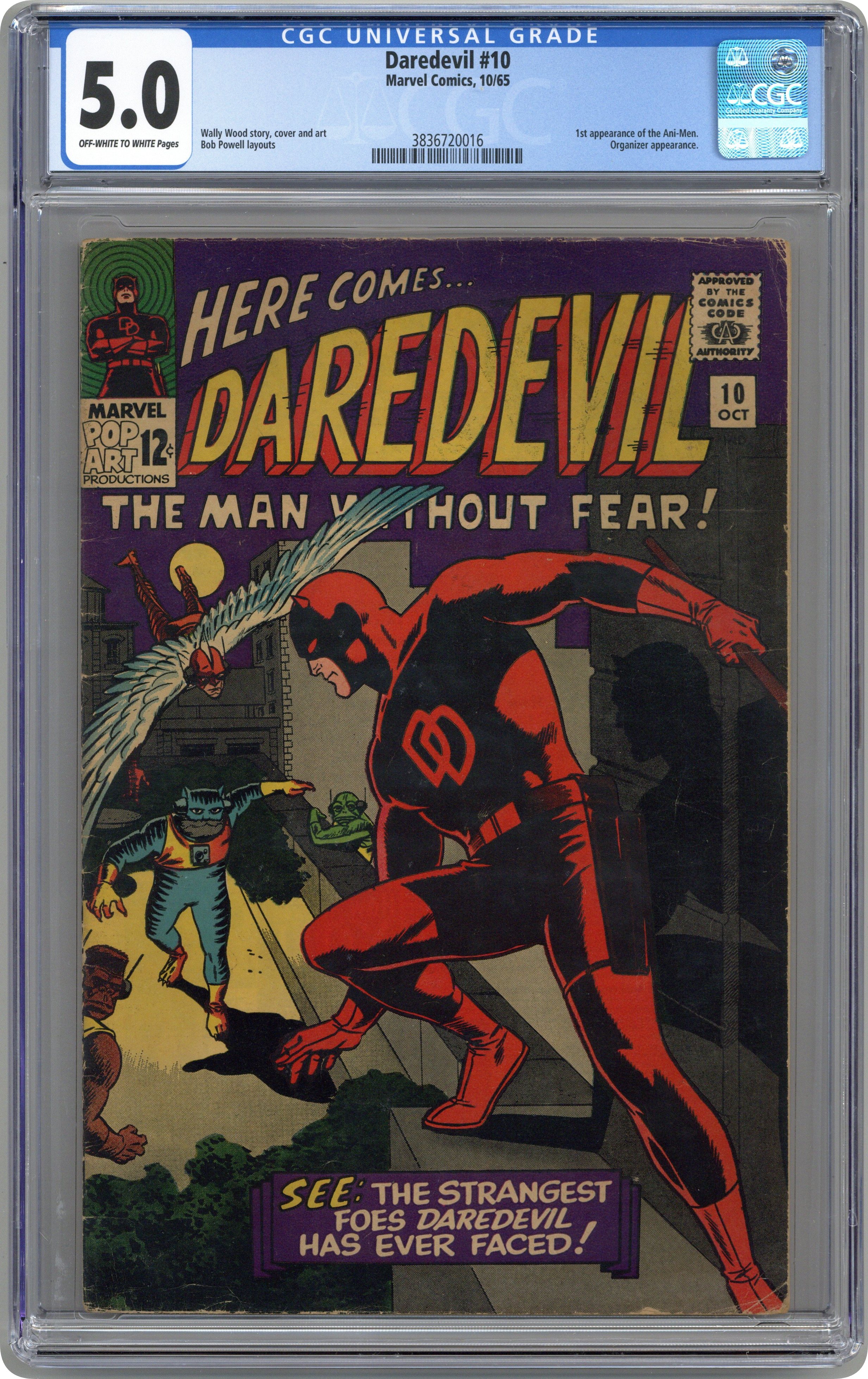Ended Jul 28 2025 Bid History 10 bids Winning Bid $78 Cover art by Wally Wood. First appearance of the Organizer, Cat Man, Ape Man, Frog Man, and Bird Man in While the City Sleeps!, script and finished art by Wally Wood, breakdowns by Bob Powell; Foggy is recruited to run as District Attorney for the Reform Party, but something shady is going on as the Organizer and his Ani-Men are involved; DD tries to solve the mystery. 36 pgs. Cover price $0.12. Cover price $0.12. Grade: CGC 5.0 explanation of grade Condition: Used (collectible)