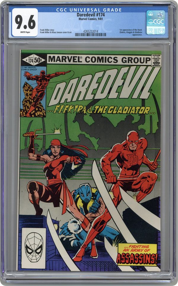 Ended Jul 28 2025 Bid History 13 bids Winning Bid $60 Direct Edition. Cover pencils by Frank Miller, inks by Klaus Janson. Elektra returns in The Assassination of Matt Murdock, script by Frank Miller, pencils by Frank Miller (breakdowns) and Klaus Janson (finished art), inks by Klaus Janson; Kingpin secretly hires the Hand to take out Matt Murdock, but Elektra and Gladiator get in the way; When the Hand blows up his law office, DD loses his radar sense due to the blast; 1st appearance of The Hand (ninja assassins). 36 pgs. Cover price $0.50. Cover price $0.50. Grade: CGC 9.6 explanation of grade Condition: Used (collectible)