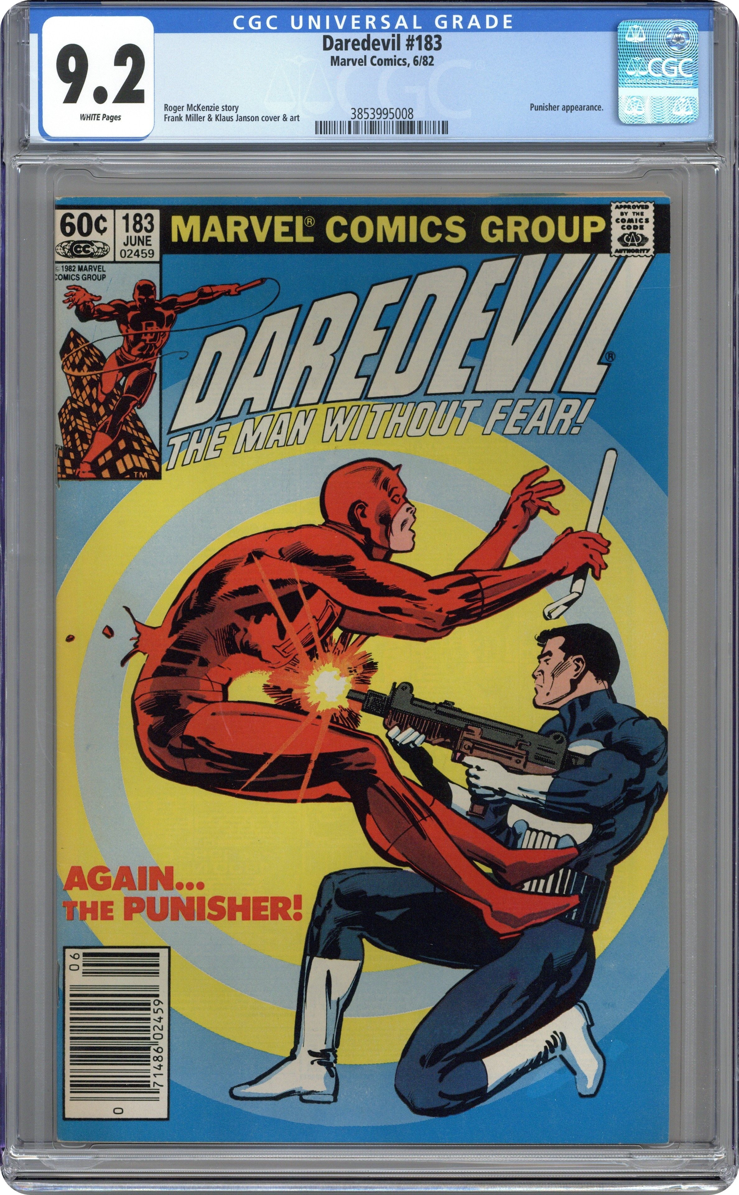 Ended Jul 28 2025 Bid History 15 bids Winning Bid $53 Newsstand Edition. Cover pencils by Frank Miller, inks by Klaus Janson. Child's Play, script by Roger McKenzie and Frank Miller, pencils by Frank Miller (breakdowns) and Klaus Janson (finished art), inks by Klaus Janson; A young girl on drugs takes a dive out of her school window and dies, and her brother, DD and the Punisher are all trying to track down the dealer responsible; Matt proposes to Heather; Hogman [Peter Grunter] is the guest villain. The last few pages are probably penciled by Janson from Miller breakdowns. This story was originally scheduled for issue 167 but delayed because the Comics Code did not approve it in its original form. 36 pgs. Cover price $0.60. Cover price $0.60. Grade: CGC 9.2 explanation of grade Condition: Used (collectible)