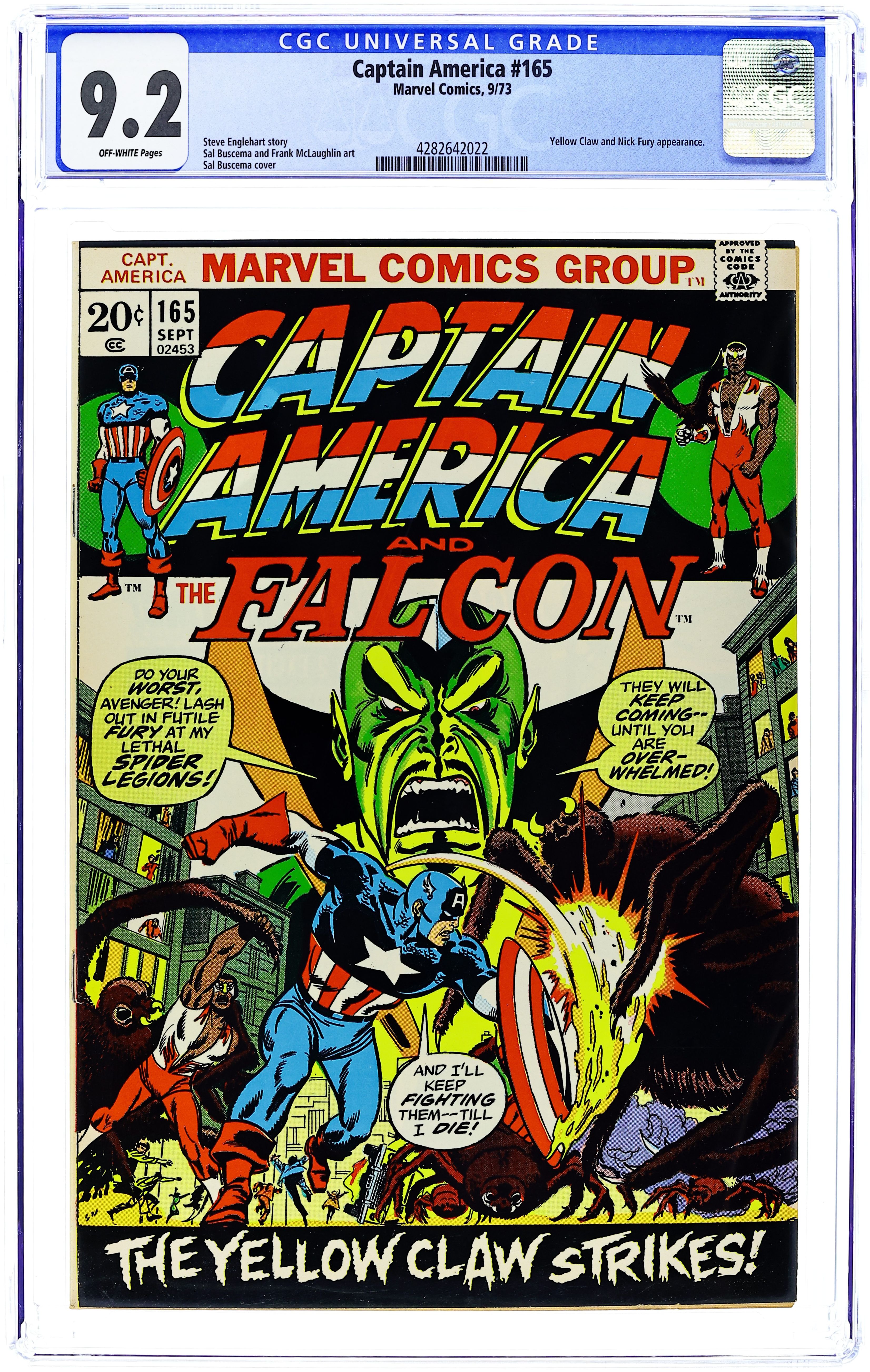 Ended Jul 15 2025 Bid History 13 bids Winning Bid $41 "The Yellow Claw Strikes" Part 1 of 3. Script by Steve Englehart. Pencils by Sal Buscema. Inks by Frank McLaughlin. Cover by Sal Buscema. Nick Fury arrives in Maryland to tell Cap that Yellow Claw has returned! In fact the Chinese super-villain was just inside Grimrock Prison evaluating his financial support for Nightshade. Cap is ready to hunt down the claw, but the Falcon wants to return to Harlem instead. So the Living Legend begins his search solo. And while motorcycling through the Lincoln Tunnel, he runs into giant spiders! Cap tackles the large arachnids and follows them into the sewer system! And then and there he meets the Yellow Claw! But sometimes appearances can be deceiving! Cameo appearances by Sharon Carter, Peggy Carter, Leila Taylor, and Suwan. (Note: The letters page includes a letter from writer Charles Hoffman.) 36 pages. Cover price $0.20. Grade: CGC 9.2 explanation of grade Condition: Used (collectible)