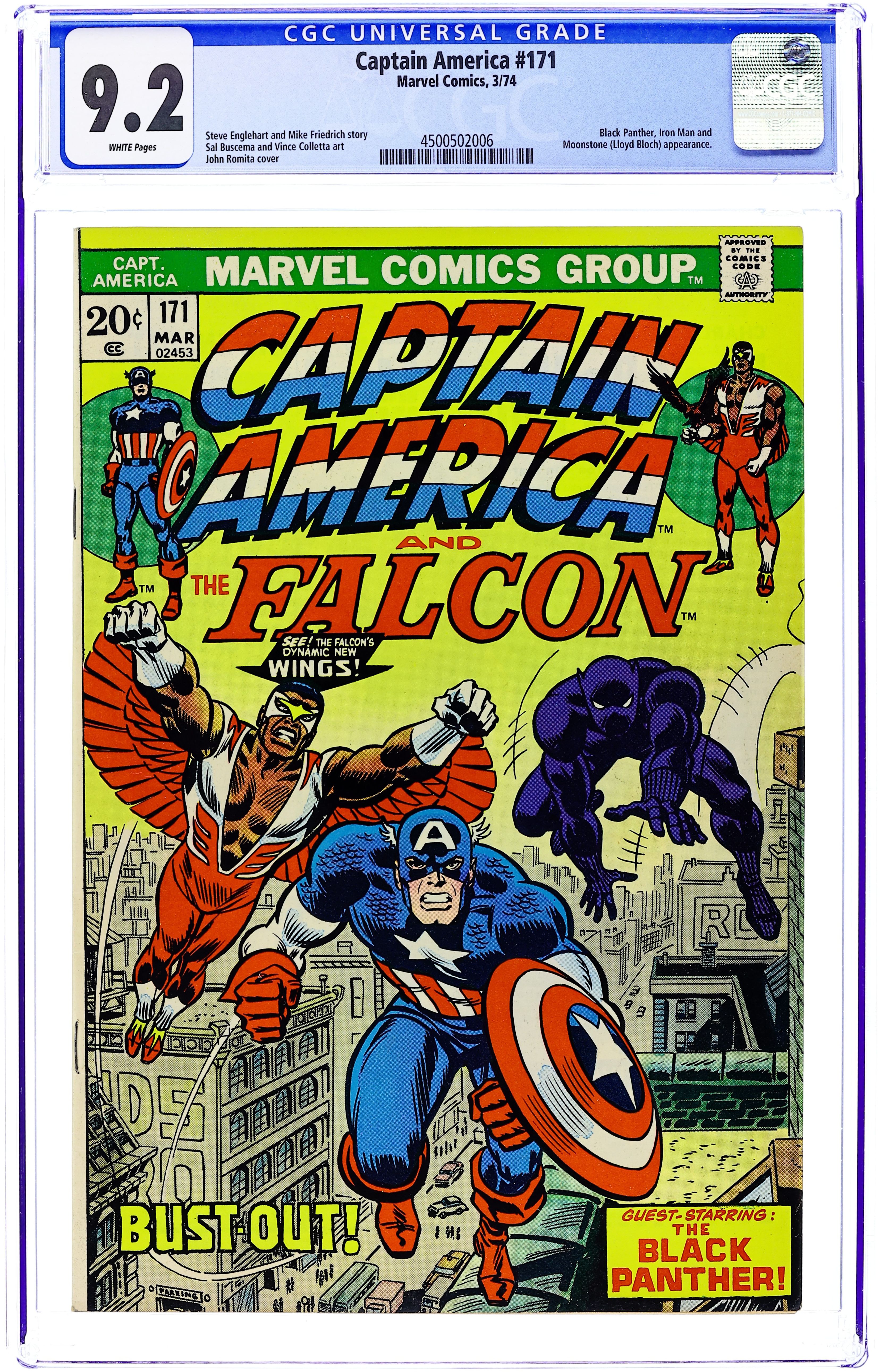Ended Aug 18 2025 Winning Bid $49 "Bust-Out!" Guest-starring the Black Panther. Plot by Steve Englehart. Script by Mike Friedrich. Pencils by Sal Buscema. Inks by Vince Colletta. Cover by John Romita Sr. and Tony Mortellaro. In Lagos, Nigeria, the Black Panther and the Falcon are hot on the trial of Stoneface! The former Harlem crime lord has kidnapped Leila Taylor, and needless to say...the newly winged Falcon wants her back! Meanwhile in New York, the Sentinel of Liberty is lying low after escaping from jail. But Cap needs his partner toreturn from Africa soon, because Moonstone is gunning for him! And Moonstone is very tough to beat! Cameo appearance by Iron Man. (Notes: Stoneface returns in Marvel Team-Up 114. The letters page contains Marvel Value Stamp series A #50 Black Panther by Rich Buckler and Frank Giacoia.) 36 pages. Cover price $0.20. Grade: CGC 9.2 explanation of grade Condition: Used (collectible)
