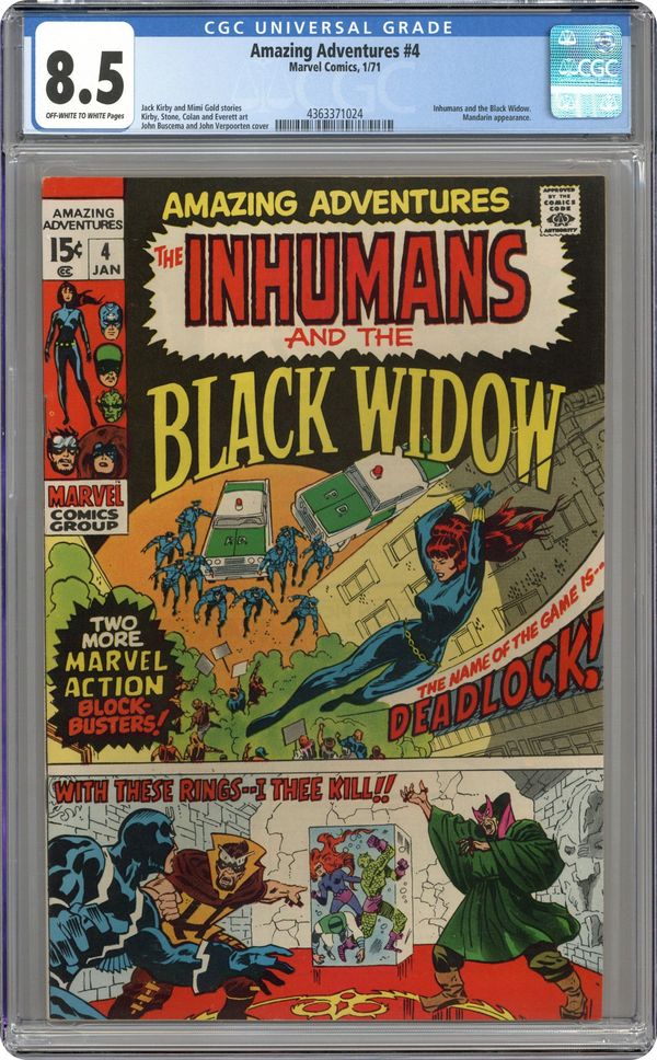 Ended Jul 1 2025 Winning Bid $27 Cover pencils by John Buscema, inks by John Verpoorten. "With These Rings, I Thee Kill!", script and pencils by Jack Kirby, inks by Chic Stone; Black Bolt removes the eye from the statute of Yin, but it speeds off as the Mandarin uses one of his rings to draw it to him. The Inhumans split up to set off searching for it and discover the Mandarin just after he has dissolved the sphere and absorbed its power; The Inhumans battle the Mandarin, defeat him, remove his rings and discard them underground while sealing in the cavern. "Deadlock," script by Mimi Gold, pencils by Gene Colan, inks by Bill Everett; The Black Widow tries to persuade the Young Warriors to leave Scarola's house. She buys them a separate building and they leave Scarola's building. Letter to the editor from comic editor Paul Levitz. 36 pgs, full color. $0.15. Cover price $0.15. Grade: CGC 8.5 explanation of grade Condition: Used (collectible)