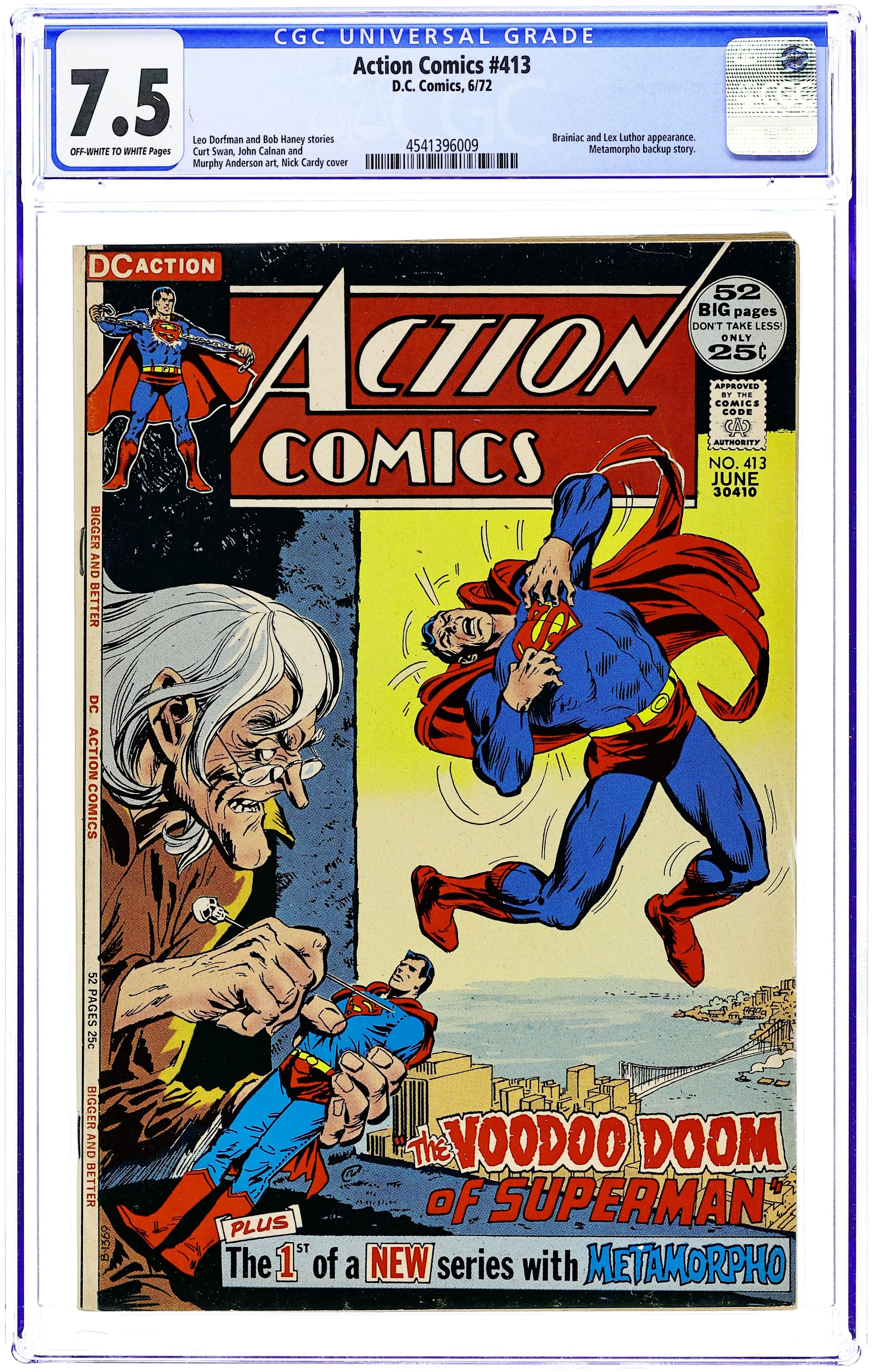 Ended Jul 13 2025 Winning Bid $21 Last 52-page giant. Cover by Nick Cardy. "The Voodoo Doom of Superman," script by Leo Dorfman, pencils by Curt Swan, inks by Murphy Anderson; Dr. Mystir uses a voodoo doll made with souvenirs of Superman to eliminate Superman's powers, one-by-one; When Luthor hears of the doll, he joins Mystir, who is actually Brainiac in disguise. Super-Turtle humor page by Henry Boltinoff. Classic reprint, "The Man Who Destroyed Eclipso," script by Bob Haney, art by Alex Toth; Mona discovers that her boyfriend, Bruce Gordon, is actually Eclipso; Bruce decides to meet an old friend, Judson Randall, and he finds him apparently imprisoned within a luminous blob. Super-Smiles humor page by Henry Boltinoff. "The 7 Sins of Simon Stagg" starring Metamorpho, script by Bob Haney, pencils by John Calnan, inks by Murphy Anderson; Simon Stagg's old college roommate, Ulysses Bronson invites Stagg and company to see his creation, Morality Mountain, which includes statues of three of the seven deadly sins. 52 Pages, Full Color. $0.25 Cover price $0.25. Grade: CGC 7.5 explanation of grade Condition: Used (collectible)