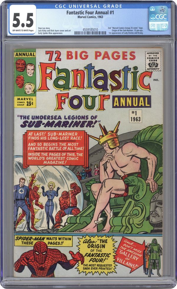 Ended Jul 15 2025 Bid History 19 bids Winning Bid $430 New Sub-Mariner/FF story: "Sub-Mariner Versus the Human Race!" Script by Stan Lee; pencils by Jack Kirby; inks by Dick Ayers. New Spider-Man/FF story: "The Fabulous Fantastic Four Meet Spider-Man!" Script by Stan Lee; pencils by Kirby; inks by Steve Ditko. Fourteen pages new pin-ups and special features by Kirby/Sol Brodsky. Thirteen-page Fantastic Four origin reprinted from FF #1 76 pgs. Cover price $0.25. Grade: CGC 5.5 explanation of grade Condition: Used (collectible)