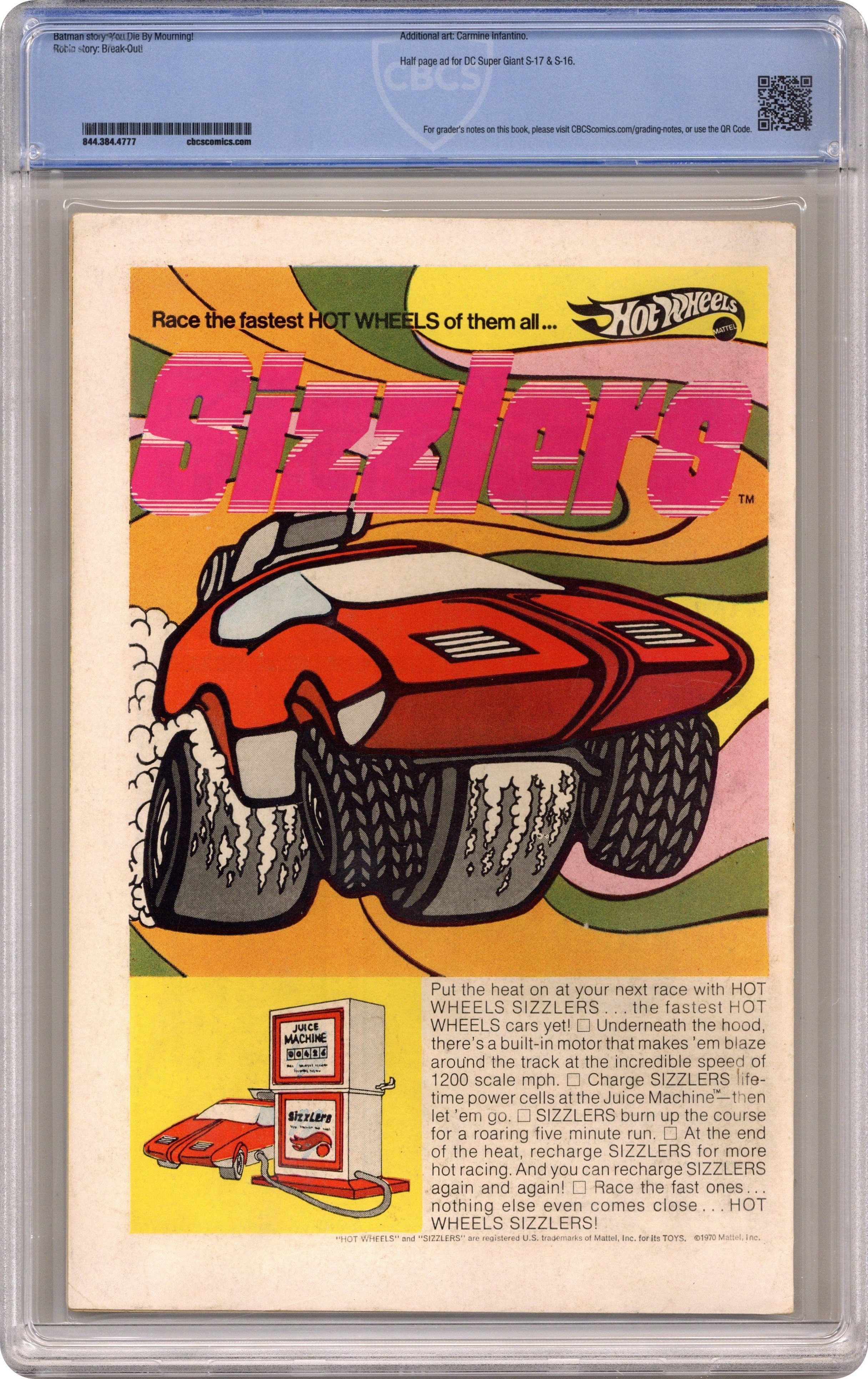 Ended Aug 4 2025 Bid History 9 bids Winning Bid $41 Cover by Neal Adams. "You Die By Mourning!," script by Frank Robbins, pencils by Bob Brown, Carmine Infantino (splash page only), inks by Frank Giacoia; Bruce Waynes V.I.P. office is visited by a mysterious woman who claims before running out that her husband will be murdered by morning, and Batman investigates. "Break-Out!," script by Mike Friedrich, pencils by Gil Kane, inks by Vince Colletta; Robin helps the police track down the escaped juvenile delinquents. Letter from comics writer Mike Barr. 36 pgs., full color. $0.15. Cover price $0.15. Grade: CBCS 7.0 explanation of grade Condition: Used (collectible)