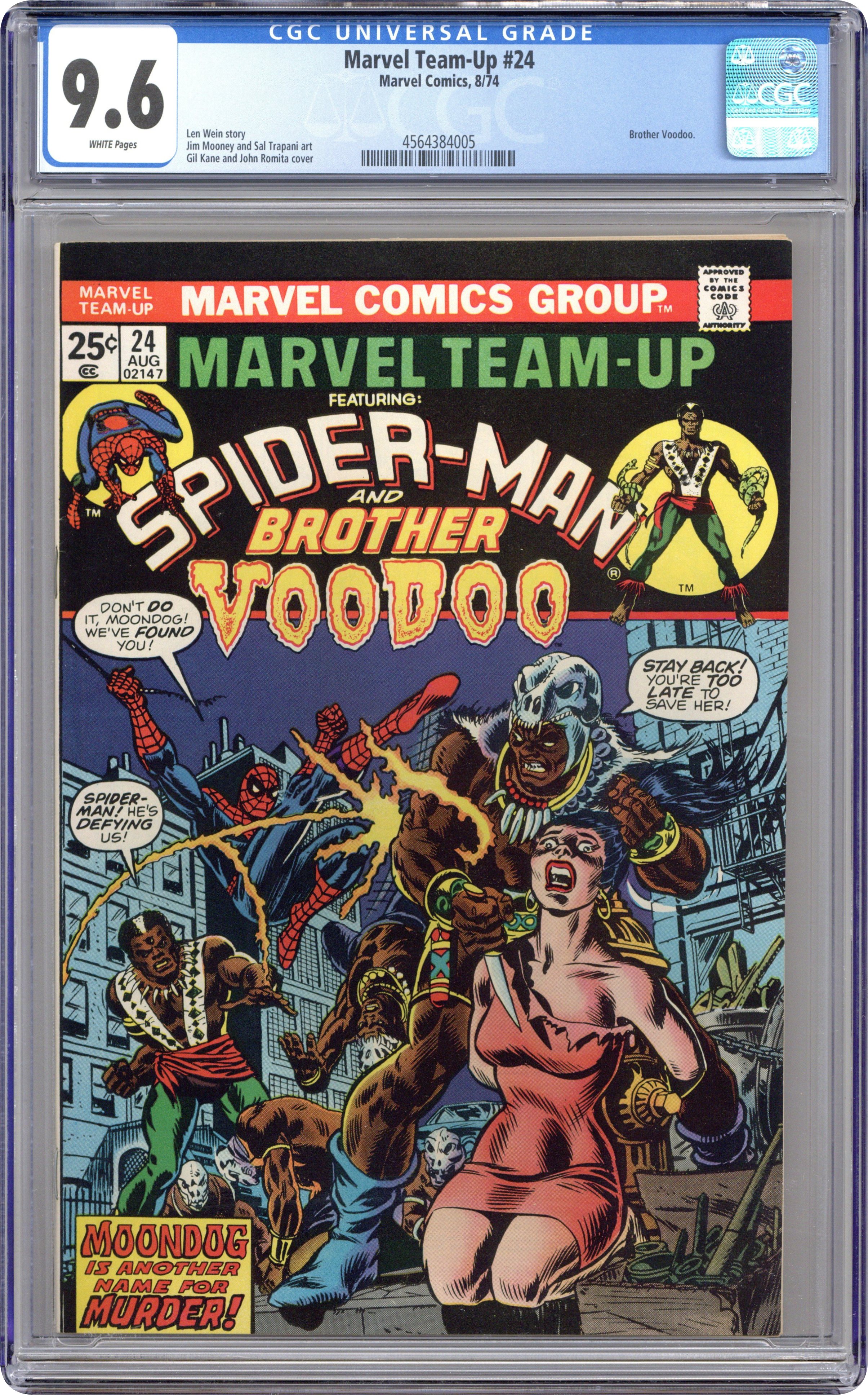"Moondog is Another Name for Murder!" Guest-starring Spider-Man and Brother Voodoo. Script by Len Wein. Pencils by Jim Mooney. Inks by Sal Trapani. Cover by Gil Kane and John Romita. Spider-Man gets mixed up in a supernatural slugfest between Moondog and Brother Voodoo! (Note: The letters page contains Marvel Value Stamp Series A #90 Hercules.) 36 pages. Cover price $0.25. Grade: CGC 9.6 explanation of grade Condition: Used (collectible)