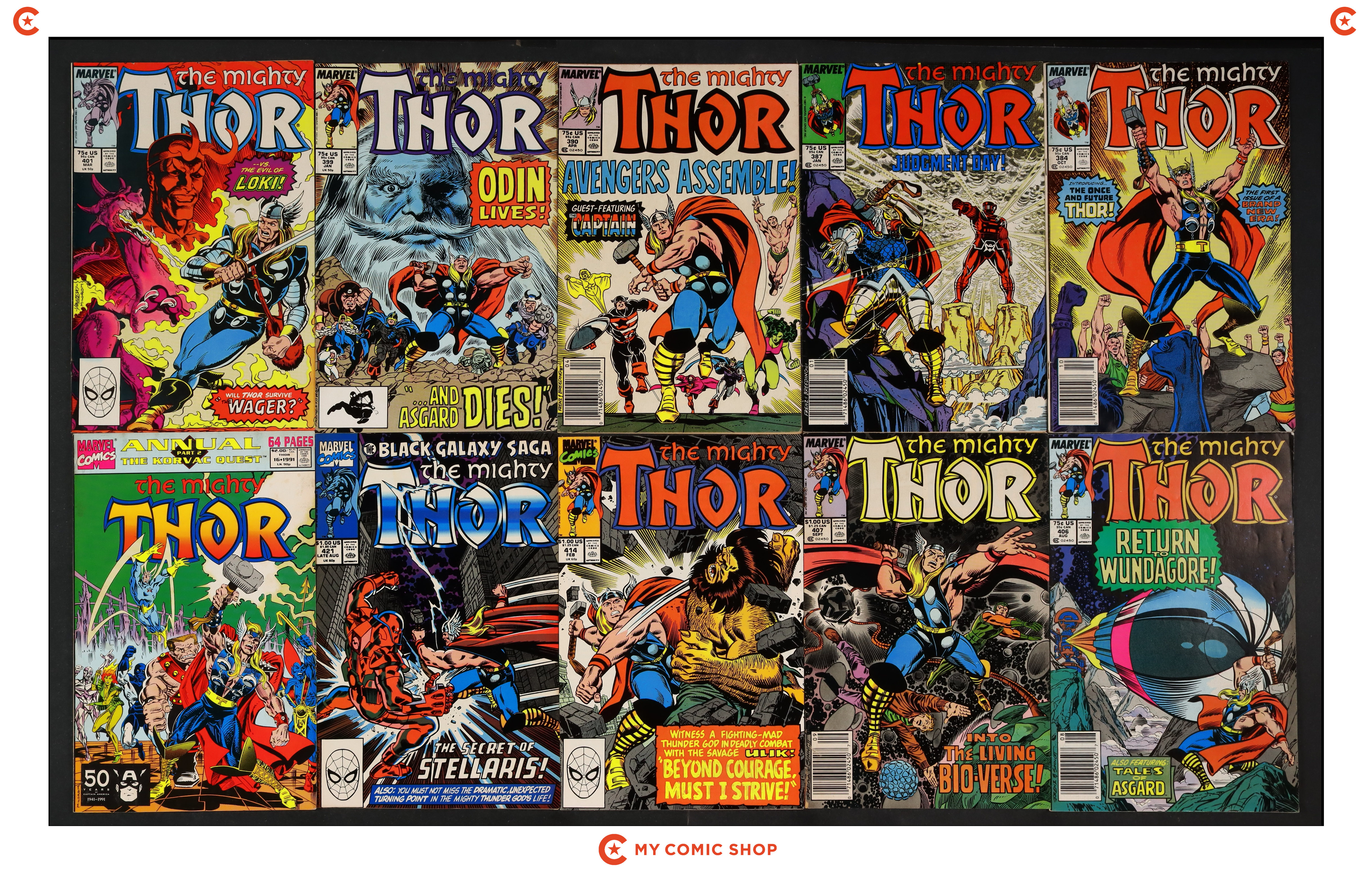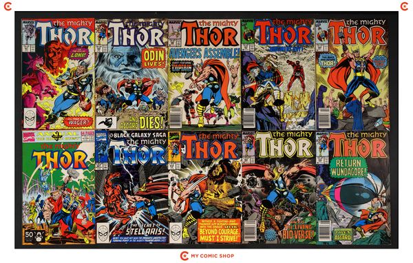Issues 384, 387, 390, 399, 401, 406, 407, 414, and 421 of Thor (1962 Marvel 1st Series Journey Into Mystery); and 16 of Thor (1962 Marvel 1st Series Journey Into Mystery) Annual. Most will grade in the FN range with some grading VG.