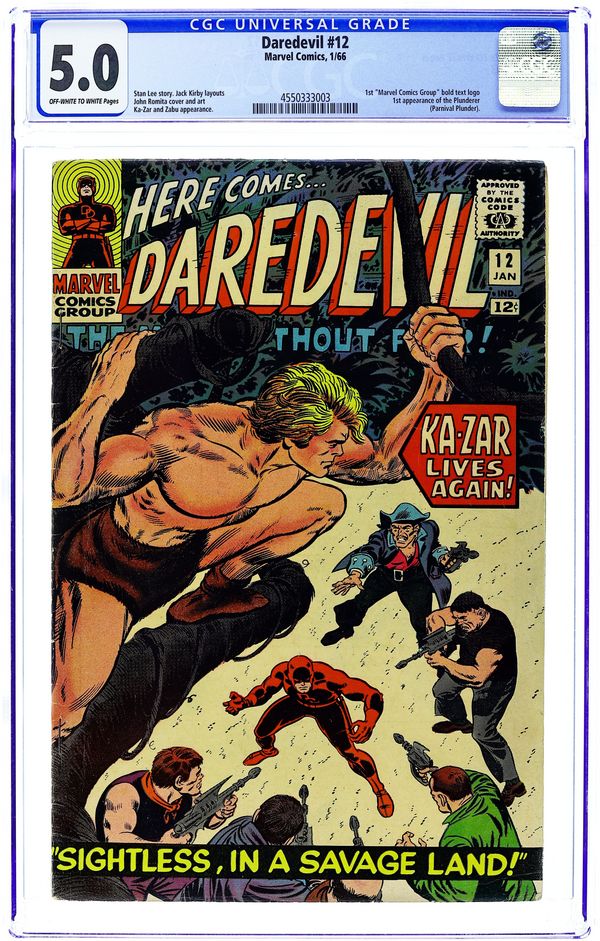 Ended Jul 8 2025 Winning Bid $53 "Sightless, in a Savage Land!" Written by Stan Lee. Pencils byJack Kirby. Inks by John Romita Sr (1st comic work) Cover pencils by John Romita and Jack Kirby (Ka-Zar figure), inks by Vince Colletta and John Romita (retouches). Guest-starring Ka-Zar. Matt decides to take a cruise to get his mind off of Karen. After his cruise ship is boarded by pirates, DD is taken to the Savage Land by the Plunderer. Ka-Zar attacks the Plunderer for trespassing on his domain and saves Daredevil's life as his costume reminds the savage lord of his encounter with the X-Men. Cameos by the Sub-Mariner, the Organizer, Mr. Fear, Ape Man, Bird Man, Cat Man, Frog Man, Stilt-Man, the Matador, and the Owl. Note: First appearance of the Plunderer. Cover price $0.12. Grade: CGC 5.0 explanation of grade Condition: Used (collectible)