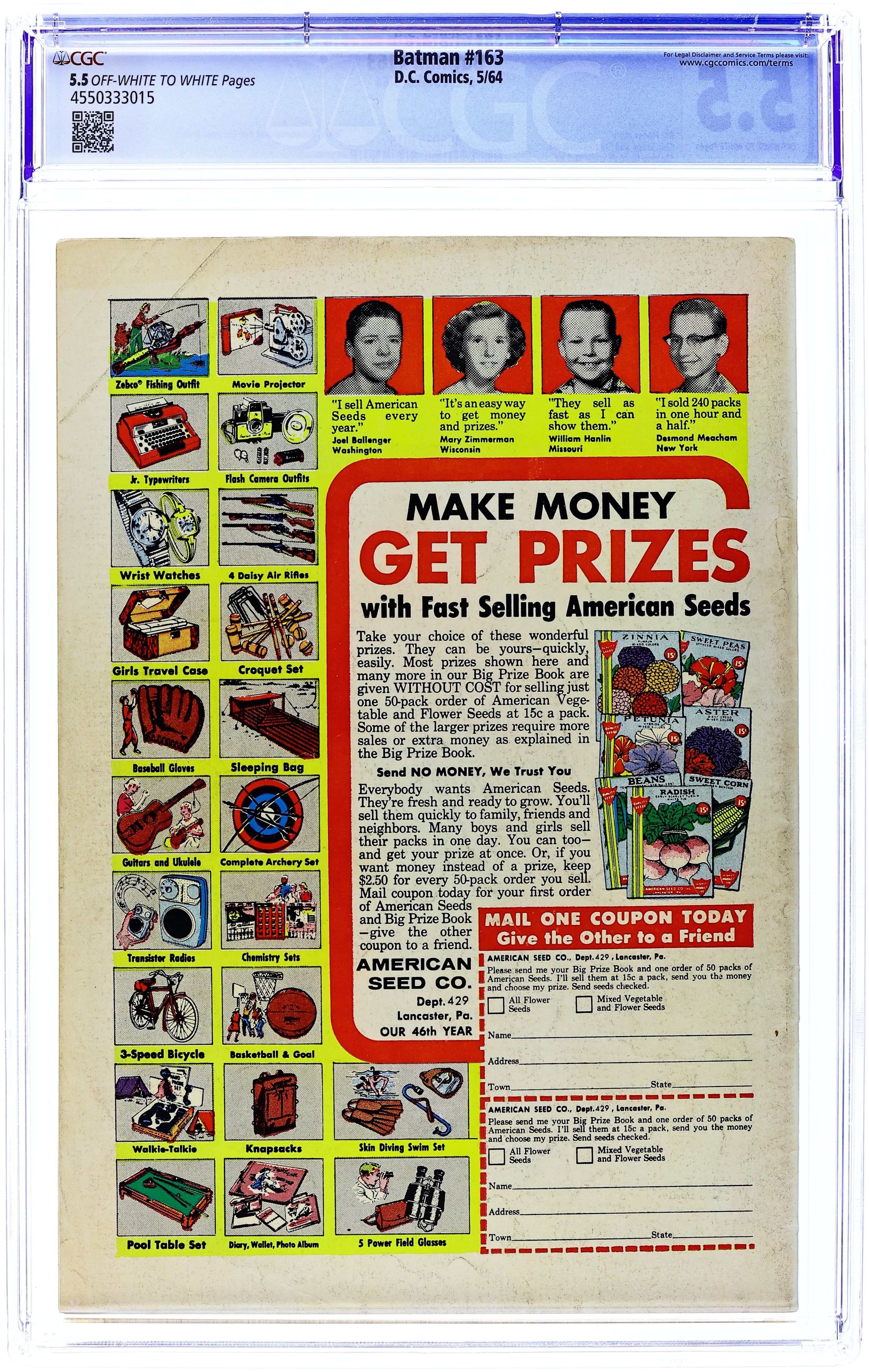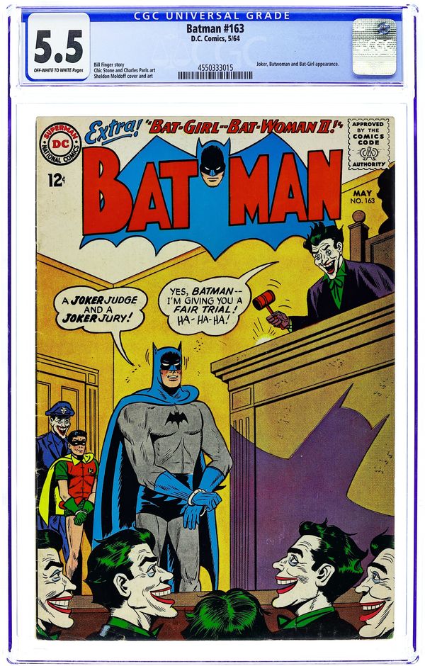 Ended Jul 15 2025 Bid History 26 bids Winning Bid $147 Cover art by Sheldon Moldoff. "Bat-Girl--Batwoman II!", script by Bill Finger, pencils by Chic Stone, inks by Charles Paris; Betty returns to Gotham City and adopts the guise of Batwoman II; With Batman and Robin II both out of town, the original Batman must go into action and gets captured in the process; When Batwoman II saves him, she learns his secret identity in the process. "The Joker Jury!", script by Bill Finger, pencils by Sheldon Moldoff, inks by Charles Paris; The Joker begins a crime wave using the city's various departments as his theme; When the Caped Crusaders head out to battle the Crime Clown, they are captured and put on trial by the Joker. Names Do Hurt! public service announcement, art by Sheldon Moldoff. 36 Pages, Full Color. Cover price $0.12. Grade: CGC 5.5 explanation of grade Condition: Used (collectible)